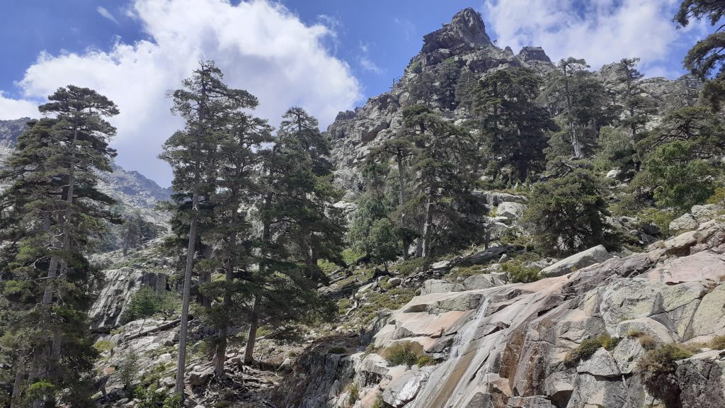 From RADULE, the path climbs off to the left (signposted for EVISA and the COL) before heading around the rockface to your right. Follow attentively the red and white markings in an easterly direction towards the GOLO River and waterfall. At the river, there is a bridge. Cross over the river, walk up hill several meters to find the GR20 trail and turn left. Follow the trail uphill, still progressing through the GOLU valley on the left bank of the river GOLU.