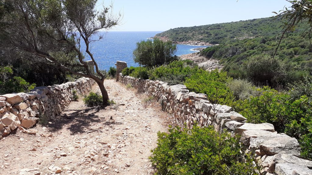 Take the road that drops down to PLAGE DE PERO pass the HOTEL TA KLADIA head up the hill keeping around to the left. From the gate, head left down the concrete steps towards the beach, turn right through another gate before reaching the coast. The path initially follows the coast before heading slightly inland, crossing an open pasture area, before entering a shady path between stone walls. After 20 minutes, the path takes a sharp left turn, remaining between stone walls but feeling more open before opening out onto the presqu’ile, after a gate, a path climbs to your right signposted CHIUNI.