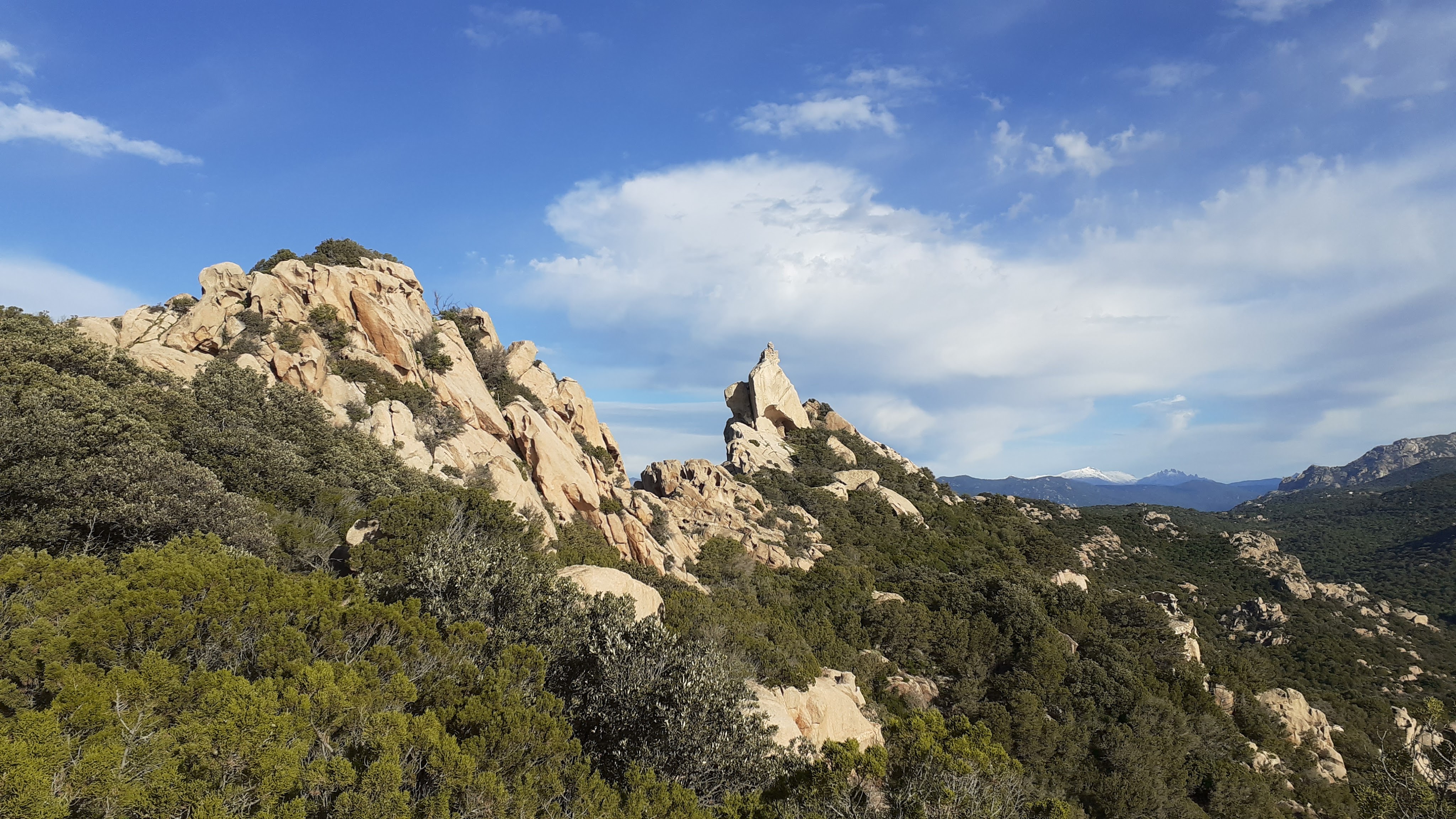 To return to the beach at ROCCAPINA, you can either retrace your steps – this would be the safest bet if you have heard any hunters – or in quieter months head north along the beach for around 5 minutes, keeping discreet. You are looking to take a track into the maquis opposite the head of the LION DE ROCCAPINA, there is a sandy track that backs the beach between the trees. The path initially heads off left, in an area of lower maquis vegetation that feels relatively open, then distinctly right over two fallen barbed wire fences (fallen down a while ago). Your climb initially starts facing the lion, and is relatively gently, ducking between bushes in little more than a hunters trail, climbing to a point with wooden hunting look out posts. The path is cairned in places, and crosses this hunting post area before going around the back of the lion in high maquis, after the higher maquis opens out you soon are on a saddle with views North to ERBAJU and South to ROCCAPINA. You soon are looping back towards two meerkat rock formations and as you drop down you again loop back (there are a number of “short cuts” to cut out the loops) finally dropping down to a track and then the path through the hedge near the barrier where you started your walk earlier.