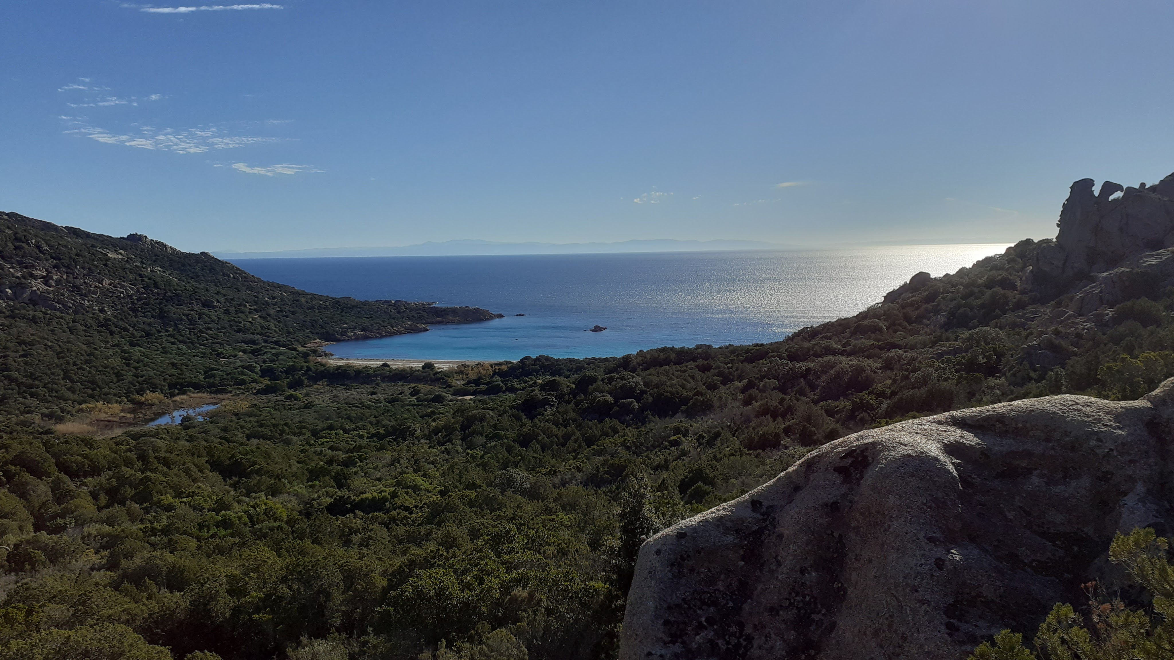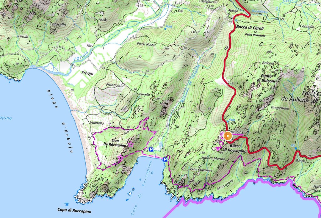 The walk starts from PLAGE DE ROCCAPINA, accessed by a sometimes steep and relatively narrow dirt track from the COL DE CORALIE, just to the north of the ROCCAPINA museum and LION DE ROCCAPINA view point. The track to ROCCAPINA Beach is practicable, if you don’t mind taking your time and haven’t got a car you particularly cherish, and is best undertaken in a 4×4 and just don’t bother trying in wet conditions. For the more feint hearted or to get in something of a warm up park on the layby just on the right after the AUBERGE DE CORALIE (if coming from AJACCIO or SARTENE) and walk the 2.5km down to the beach.