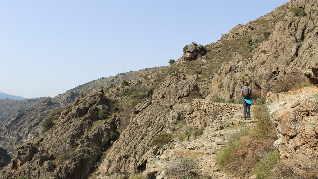 You start at the spring, fill your water bottles if you haven’t already done so. Take the rising path to the left of the spring, waymarked ORANGE VIOLET. The path leads up through the rocks and soon becomes a cobbled mule path that runs parallel to the D84, SCALA DI SANTA REGINA road. The path follows the mountainside, passing a small waterfall FALCUNAGHJA, clinging to the side of the valley, then after 2km, you will arrive at a river and bridge at la RUDA, indicated with a red star on your map, it is a good place for a first break.