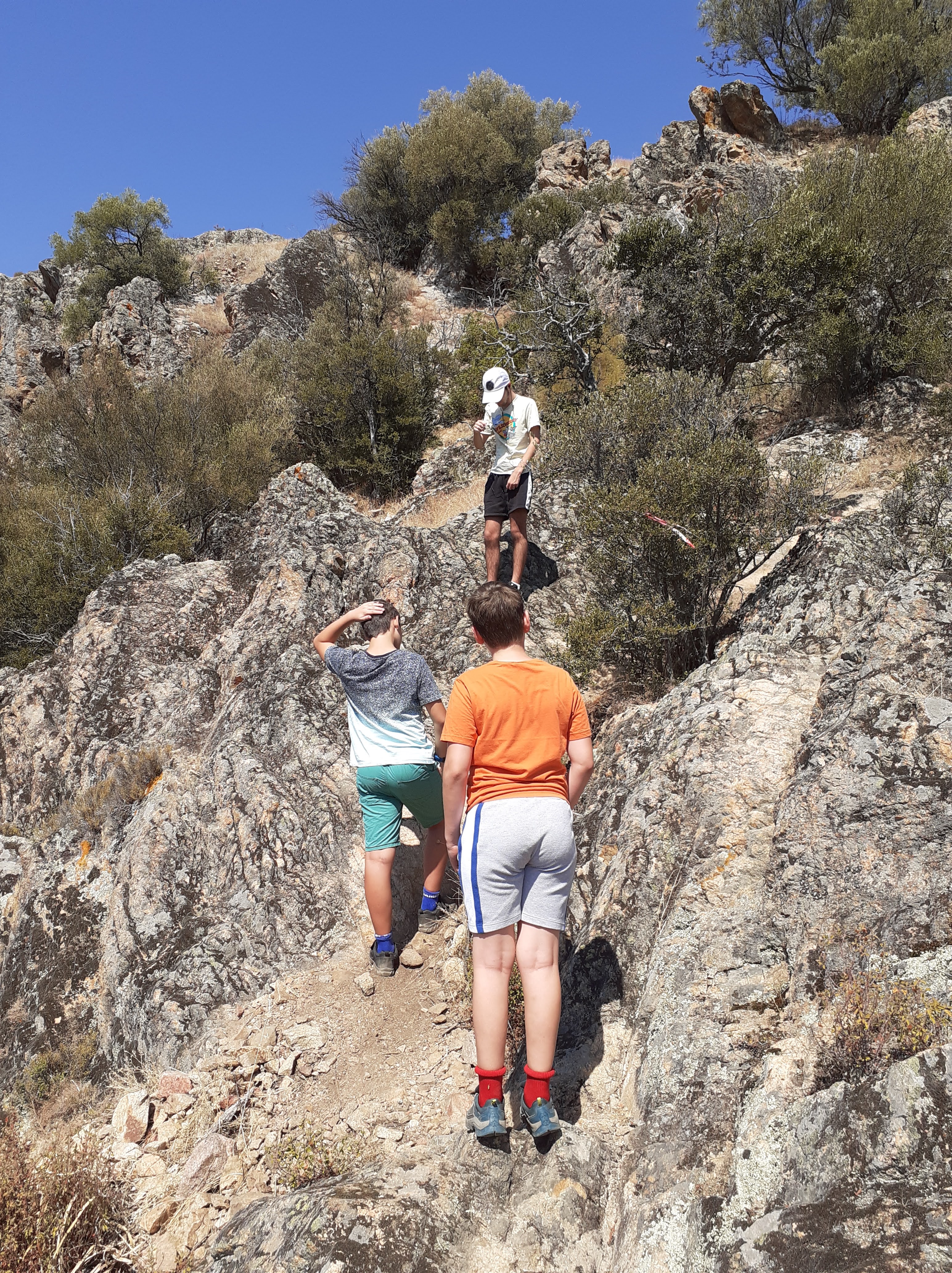 From here, for the summit of LA ROCCA*, continue straight on uphill, up the “V” shaped gully ahead, past a small bush, then up left, then right on a zig-zag path, which ends in a steep rocky gully little more than a few metres long. You will need your hands and you need to be nimble as it is pretty vertical but the rocky gully soon comes out below the summit at olive trees. From here the easiest route after this scramble is to skirt around the right hand side of the plateau, before climbing to your left to discover the flag and the view.