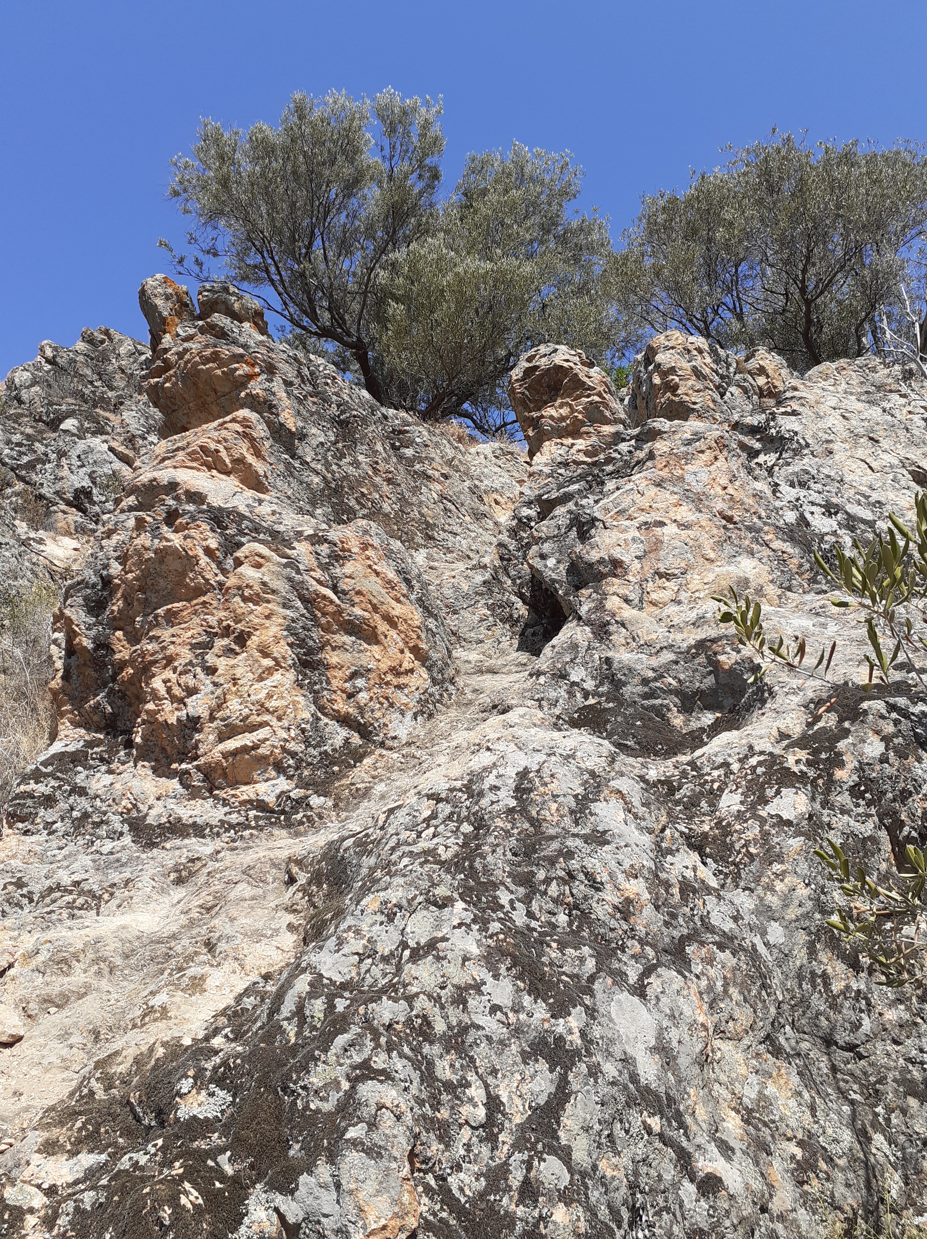 If continuing to the ARCHE DE CAURO, from this junction, just after the metal Corsica symbol, there is a steep downhill rocky section that requires care. You are heading across the slope downhill, in a rough zig-zag – any which way you can to be honest – to reach the olive trees below. The path after the trees cannot be seen from above, but it flattens under the trees to more of a balcony path that skirts around the foot of LA ROCCA, crossing some more rocky sections.