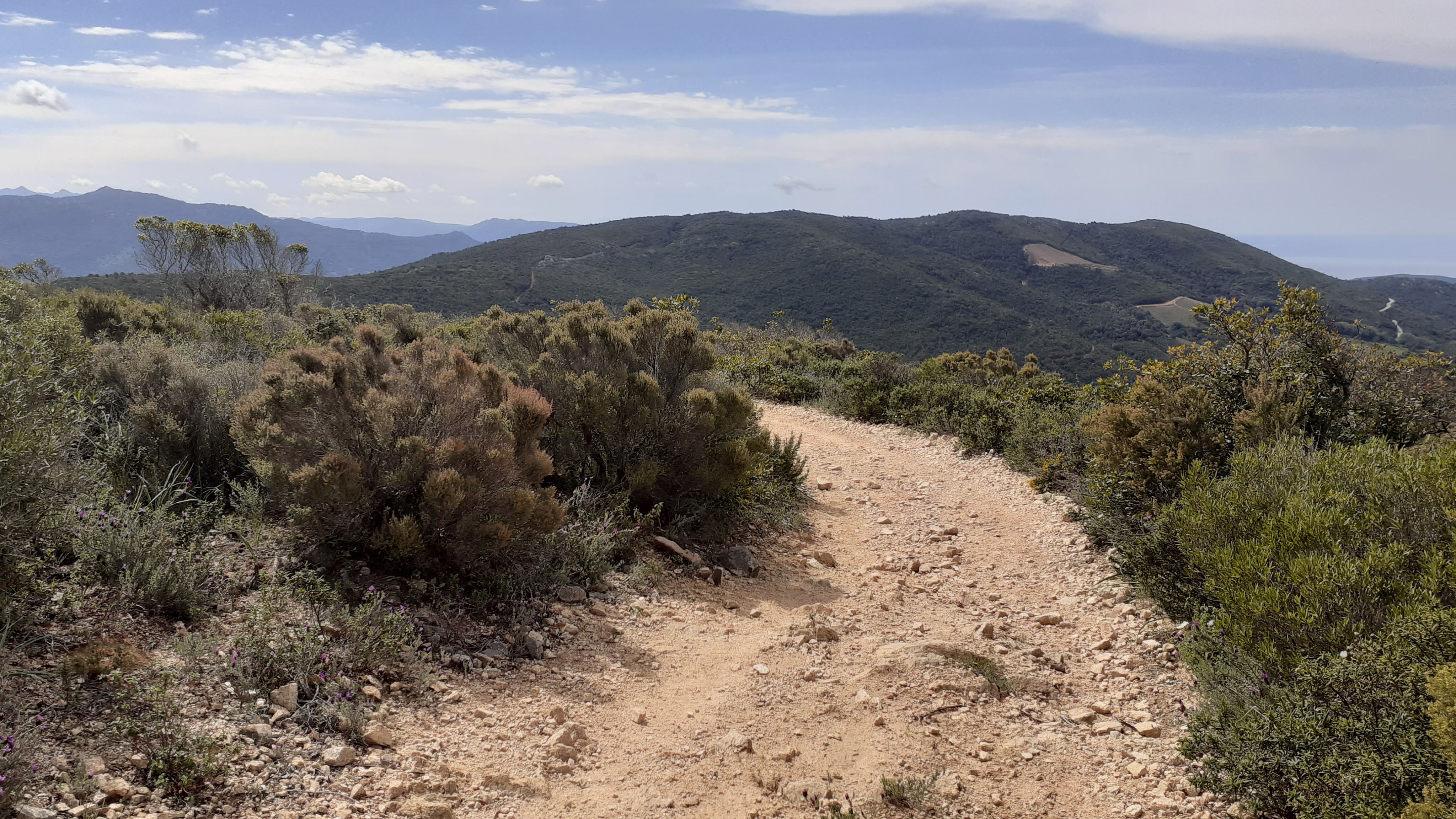 After the first large house, take the climbing track behind between other houses in the hamlet, you will see that some houses are still abandoned. You can explore, just watch out for the dogs ! At the last house with the bread oven in the garden take a falling path on your left, that soon levels onto a balcony path, then starts to climb under trees again. The path is easy to follow, shortly after the village there is a rocky bank to climb but this can easily be avoided by taking a switch back path to your right. Continue up the hill, views open up from time to time, climbing between stone walls. 2km after leaving the hamlet at Sant’ Amanza, after passing a bergerie on your left, and a track that crosses the path, you arrive at the 531m alt pt and a signposted junction GIRU DI PIETROSEDDU (in two directions) and ACCELESCA in the direction you have come from.