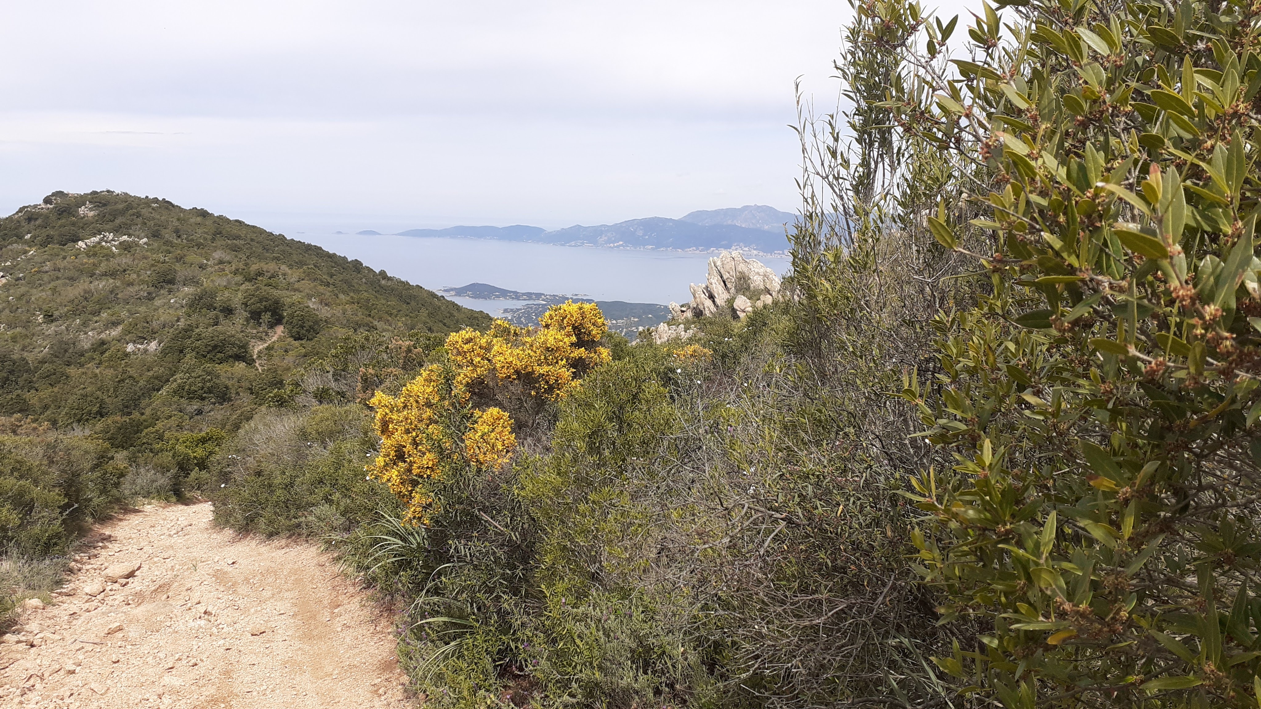 Cross the village and take a steep right, onto a path that climbs into the dense woods at a house with white shutters signposted COTI CHIAVARI and GIRU DI PIETROSEDDU. The path climbs up through the woods alongside old stone walls, covered in bright green moss. After 30 minutes you drop down to reach a path junction, with a wonderful vista over the southern Ajaccio Golf, keep left, signposted and heading towards COTI CHIAVARI. The trail joins the PRUNU plateau with mid height maquis and woodland and stone blocks. Stay attentive to the ORANGE waymarks. After crossing through a stone wall, you reach a track signposted right BUVETTE / POINT DE VUE PANORAMIQUE (you could stop for a refreshment and a panoramic view if it is open), head left along the wide track, you continue along this past the large pylons for approx 400m. The track meets another coming in from the right, keep left signposted COTI CHIAVARI and continue along for another 250m, and as the track heads off left downhill, you head right steeply uphill to the trees to reach MONTE CANARELLU (630m). The view soon opens up and you continue on the ridge, stay attentive, for the loop walk you are heading towards the next pylons at a junction with a falling rutted track (low cairn – direction BOCCA DI GRADELLE) take the short climb to the summit of MONTE TIGNOSU.