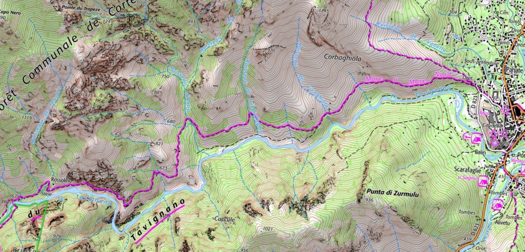 The TAVIGNANU gorge is one of Corsica’s most beautiful spots and a firm favouite with locals and tourists alike. Unlike the open pine escarpments of the nearby RESTONICA valley, the TAVIGNANO is deep, enclosed and offers glimpses of large rock pools below. This age old mule track once provided the way into the neighbouring NIOLU valley and now forms part of the MARE A MARE NORD. The path up through the TAVIGNANO is very Mediterranean, blue-black lavender, curry plant and other wild herbs. Swim spots in the river.