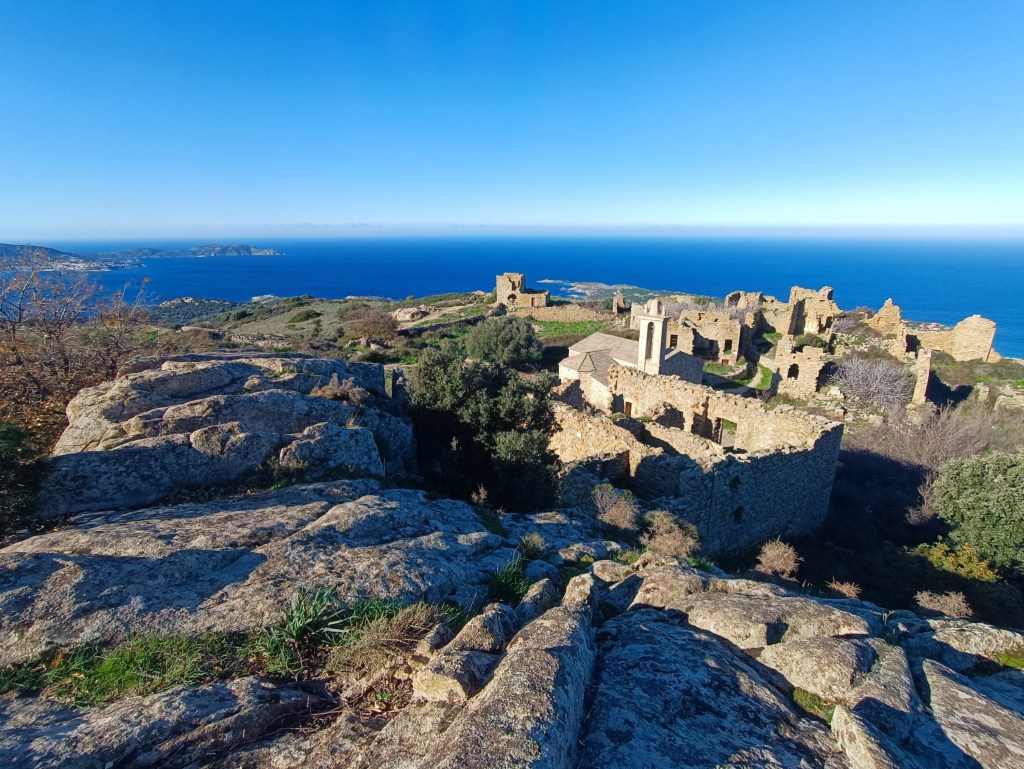 Park at the car parking area, near the A CASA DI MA hotel. Follow the signs for OCCI and on foot take the lane that passes the rear of the hotel. The path soon starts climbing on a relatively well waymarked YELLOW cobbled path between stone walls, zig zagging through a landscape of boulders with the coast to your left. The climb takes around 25 minutes and the views over the seaside resort of SANT AMBROGGIO and the PUNTA DI SPANU are amazing. You arrive at the village of OCCI. Explore the village without climbing on the ruins. For a birds eye view, cross the village going behind the church, with your back to the church and the sea, head left between the hill and a house, follow the path and as it climbs, over rocks towards a crop threshing circle. You have a great “birdseye” view of the village.