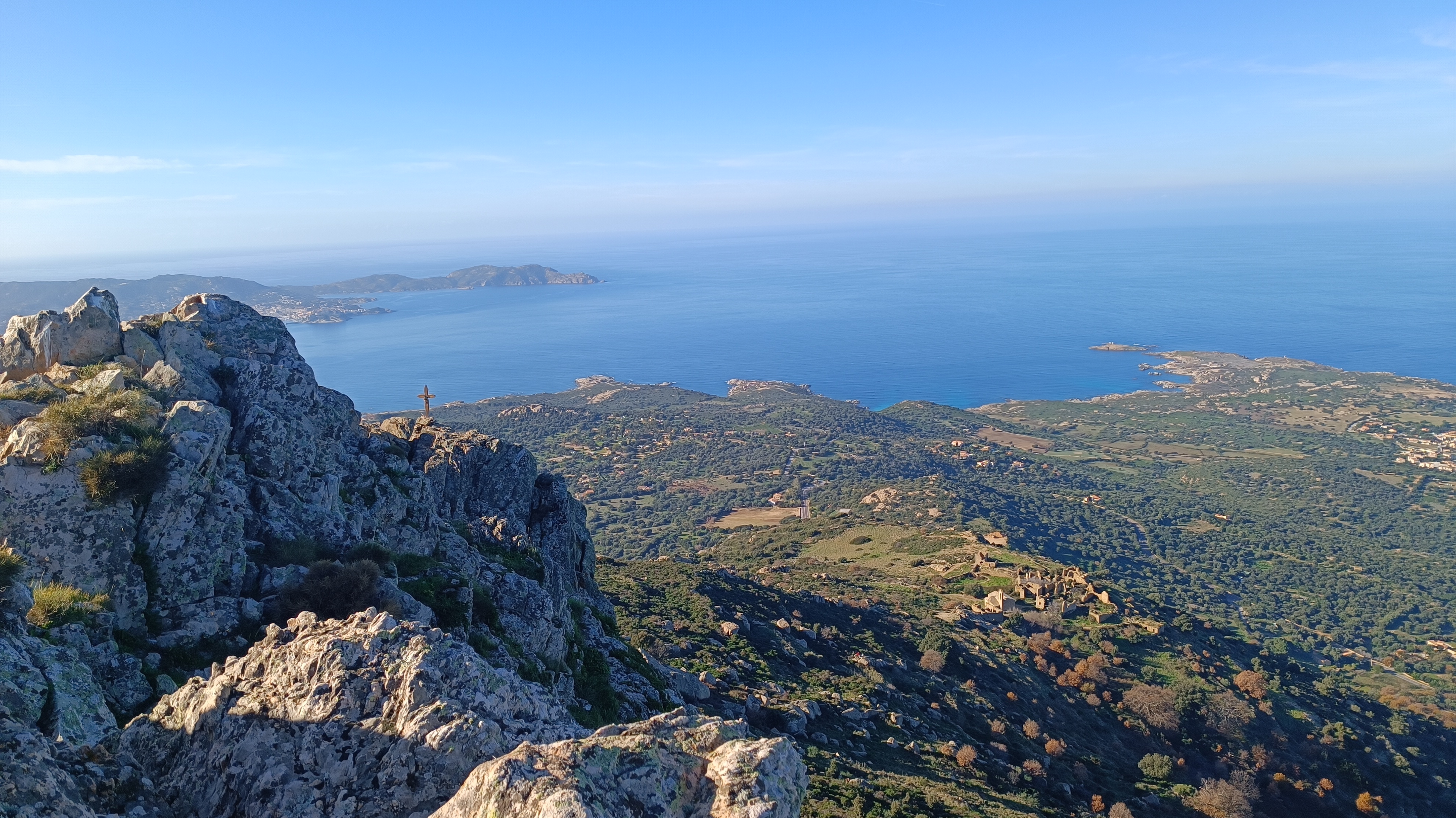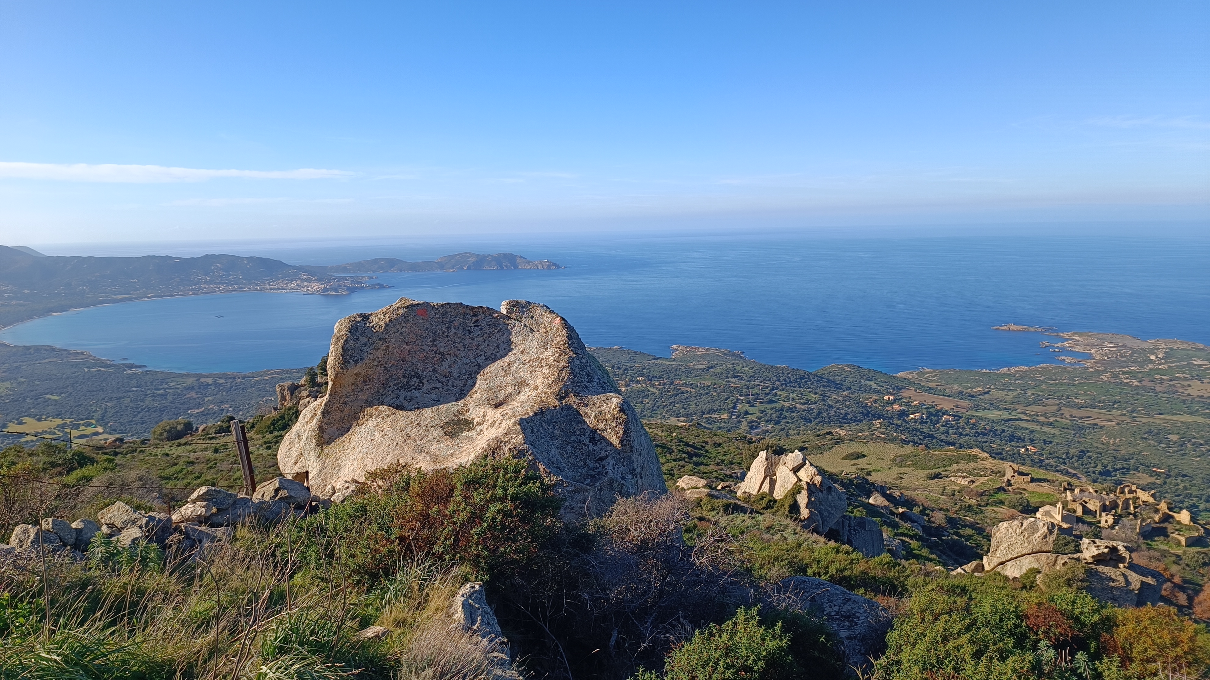 For a sporty loop walk, keep heading away from village climbing on an untidy path with old RED waymarks. Passing the stone crop threshing circle, after 20 minutes the path zig zagging reaches a flatter balcony section, between two large rock formations, continue a gentle climb with a stone wall on your right being very attentive to the waymarks, below the Capu d’Occi. The final climb is quite steep in a gully to the left of Capu d’Occi (but without danger). When the path levels again at a saddle, it is a gentle cairned climb to the right to reach the summit of Capu d’Occi.