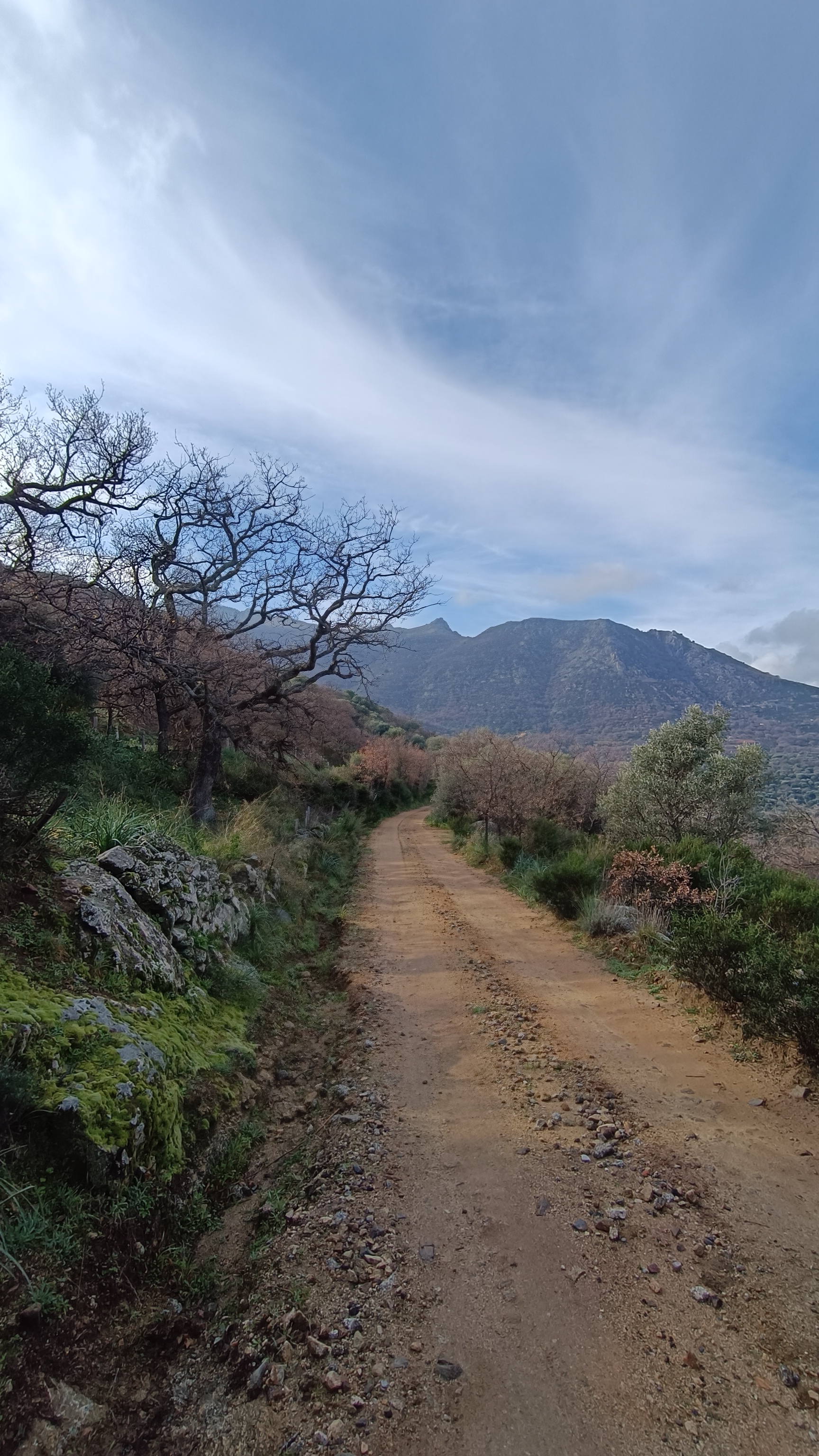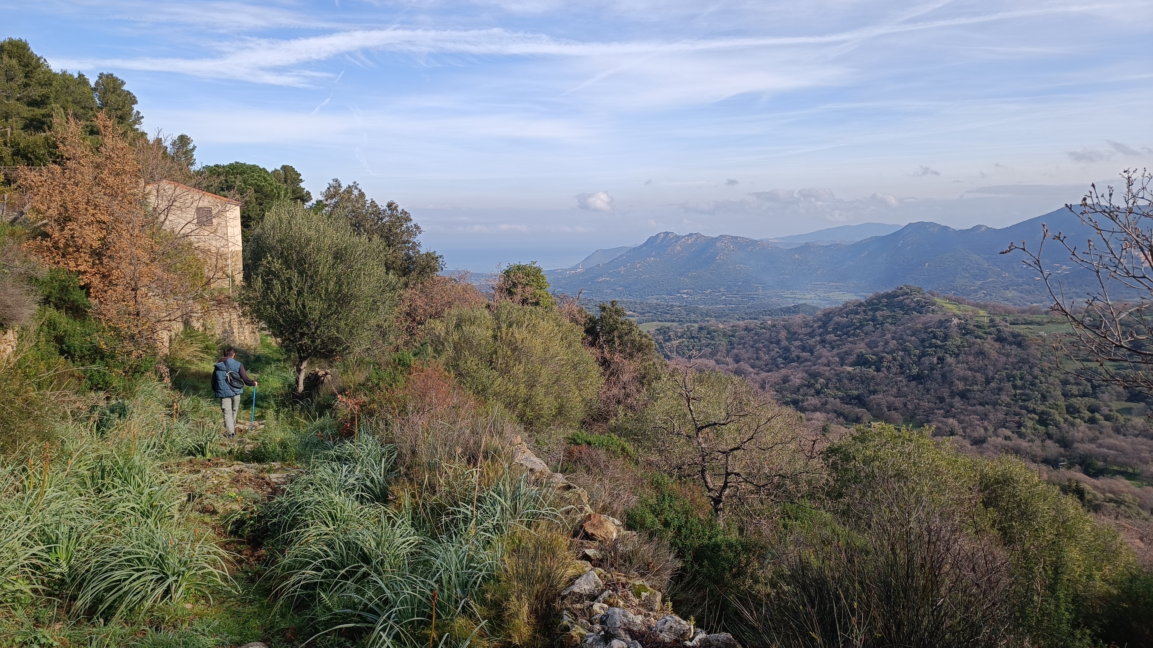 Continue on the path across this flat area (care brambles), taking a distinct right turn before crossing a stream on stepping stones, keep following the path until you reach a ramshackle gate with a GUISTINIANI signpost. After the gate, you meet the track from the ruined house (for a shorter walk you can turn right here, climb to the ruined house and turn left retracing your steps from earlier back to SPELONCATO). The sandy lane turns left downhill and arrives at a distinctive blue shuttered house.