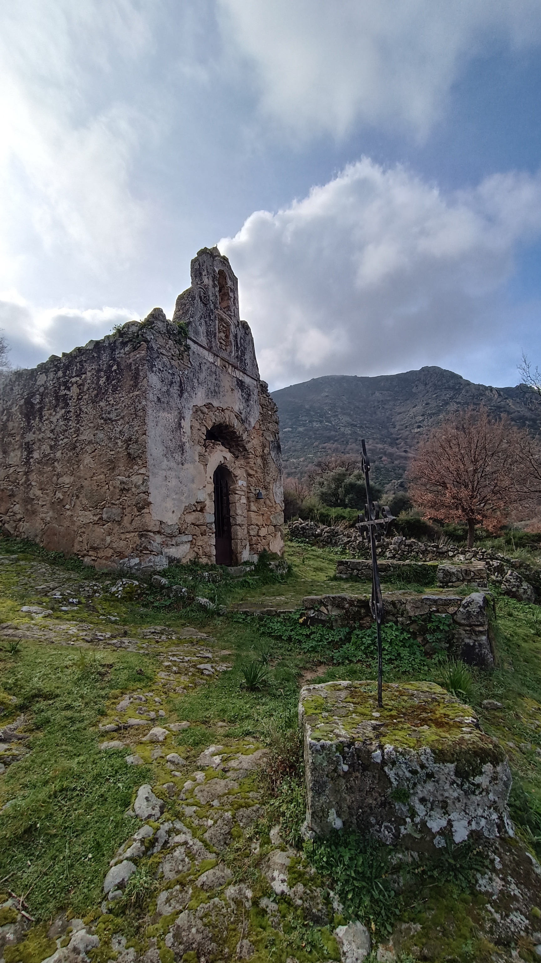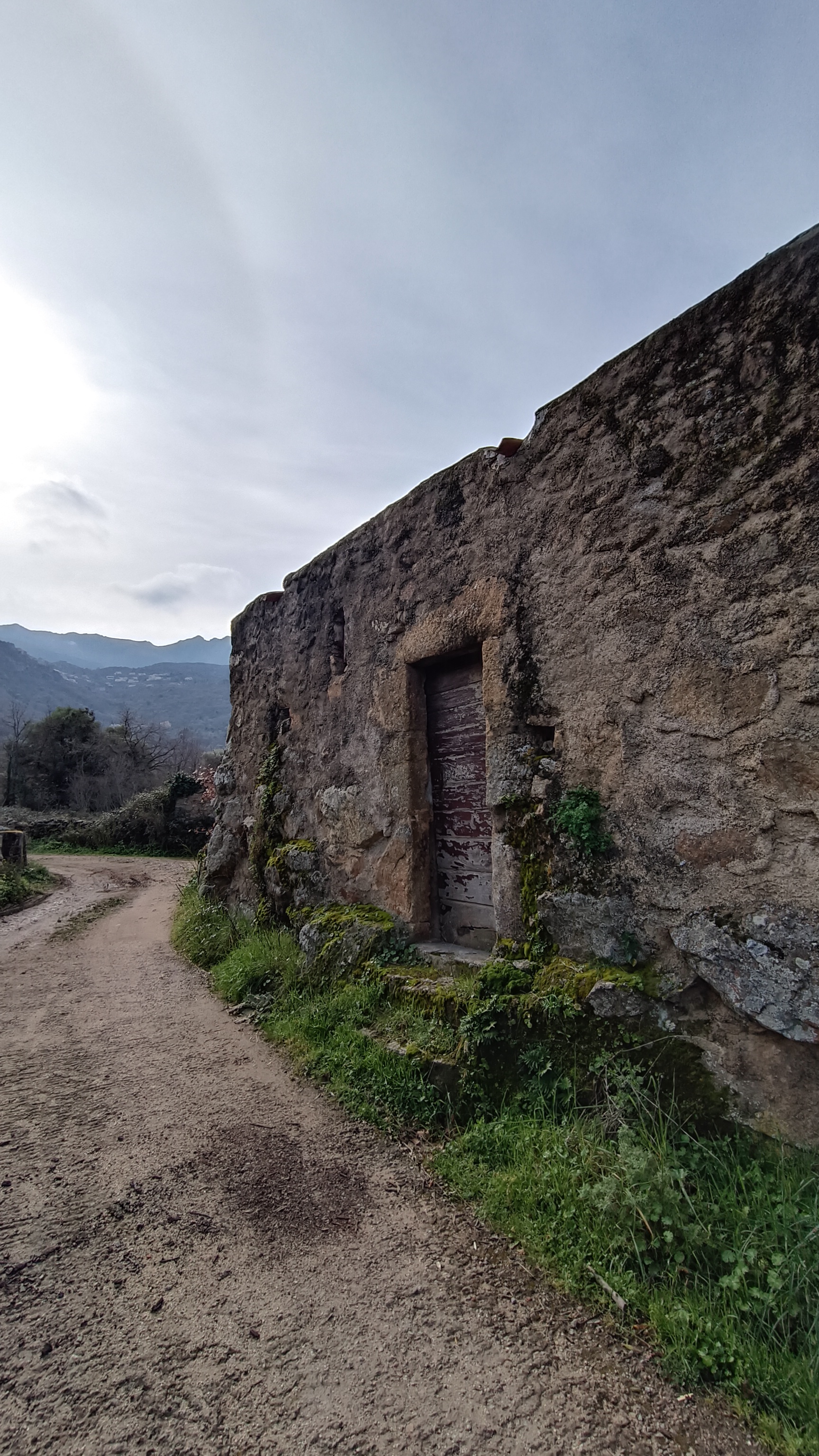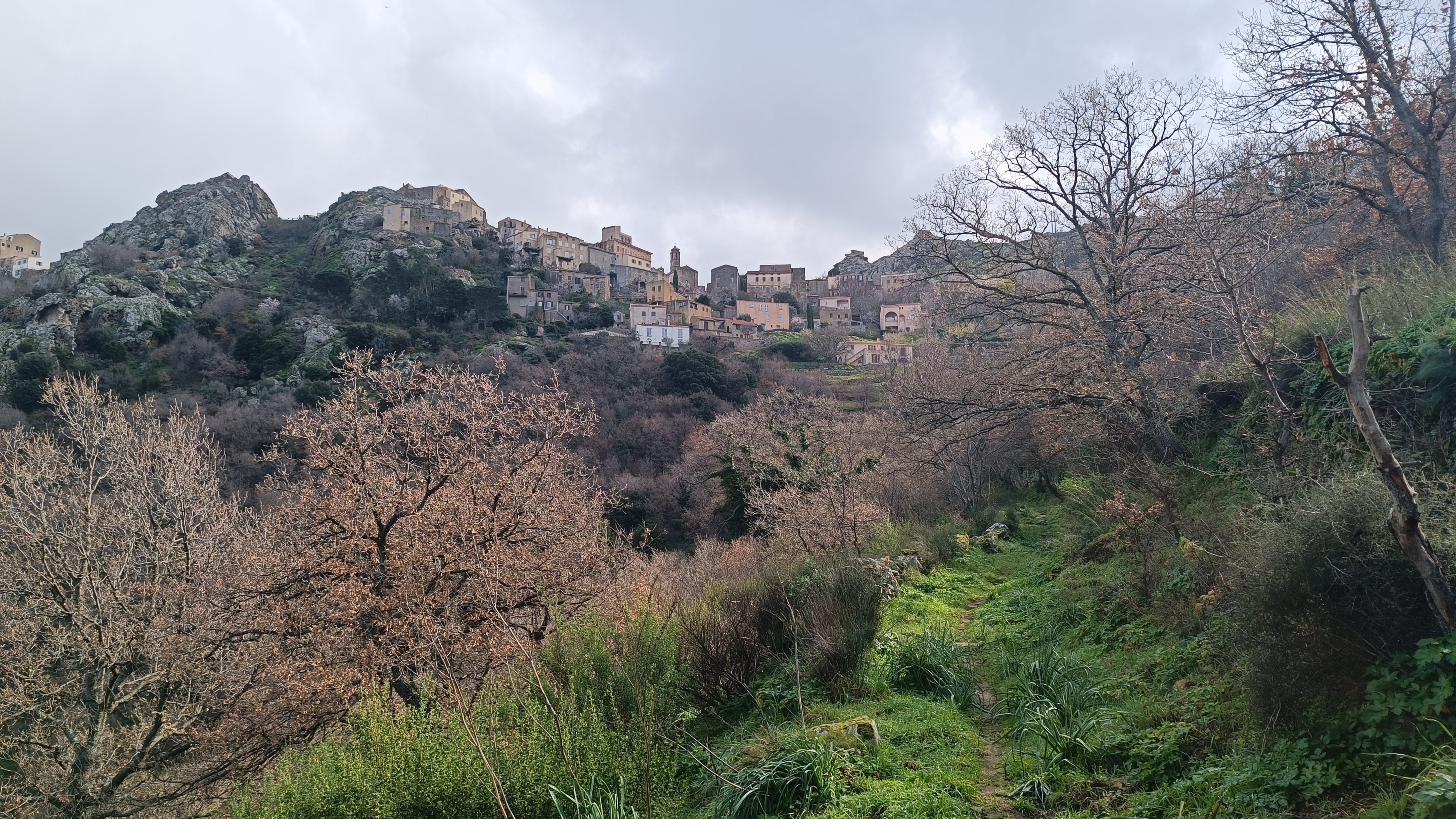 From the village square, take the cobbled lane between the A SPELUNCA hotel and the beautiful chapel, yellow signpost BOUCLE DE GUISTINIANI and MONTECELLU. Following YELLOW waymarks. You drop down zigzagging through the narrow village alleyways to a large parking area, at the bottom of the village, from here head right as the path leaves the village at a red hydrant next to a house. The path switches back left after gardens and you drop down on the grassy path as it leaves the village behind passing a spring and a first ruined chapel SAN ROCCU (XV/XVI th Century).