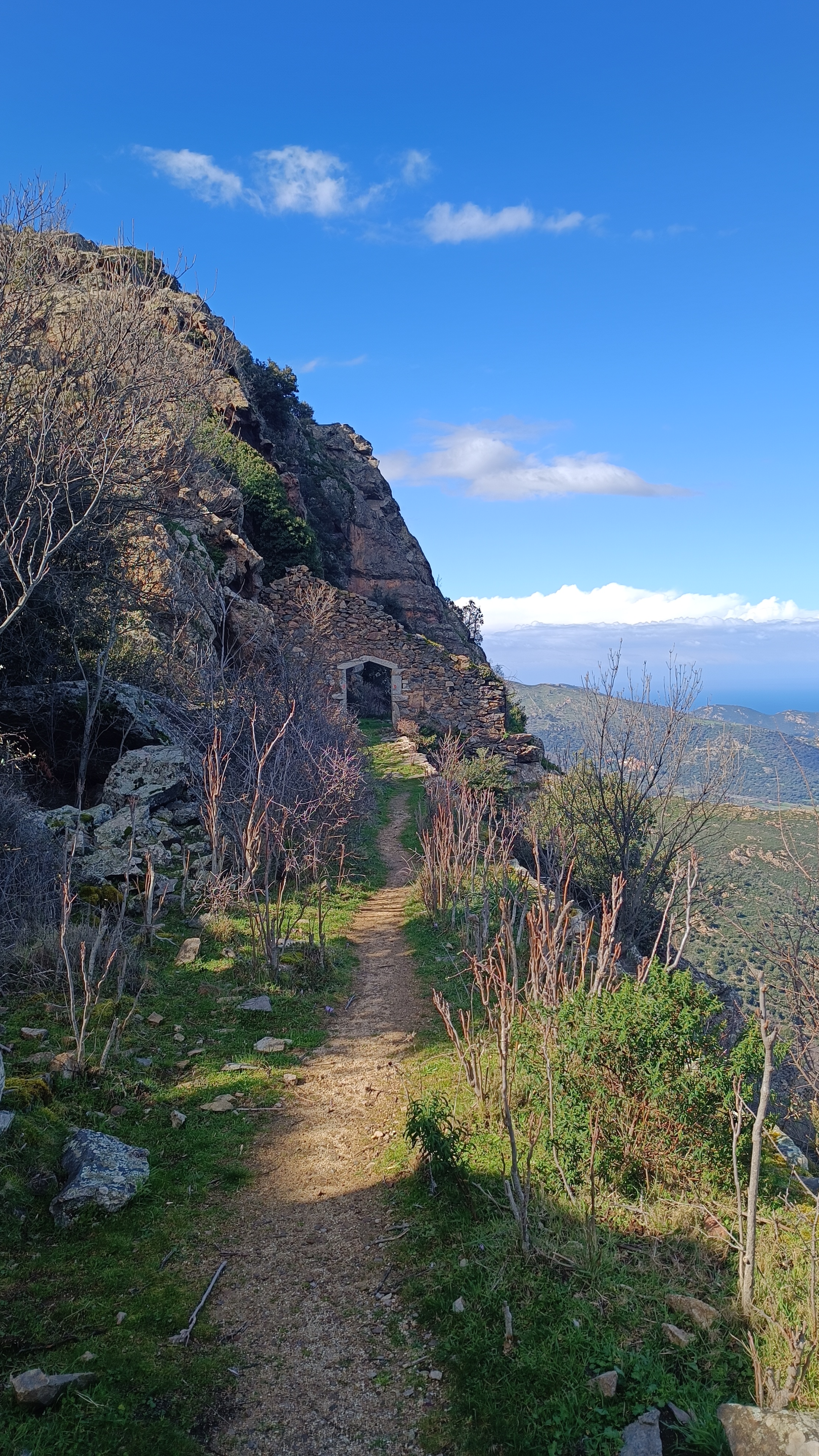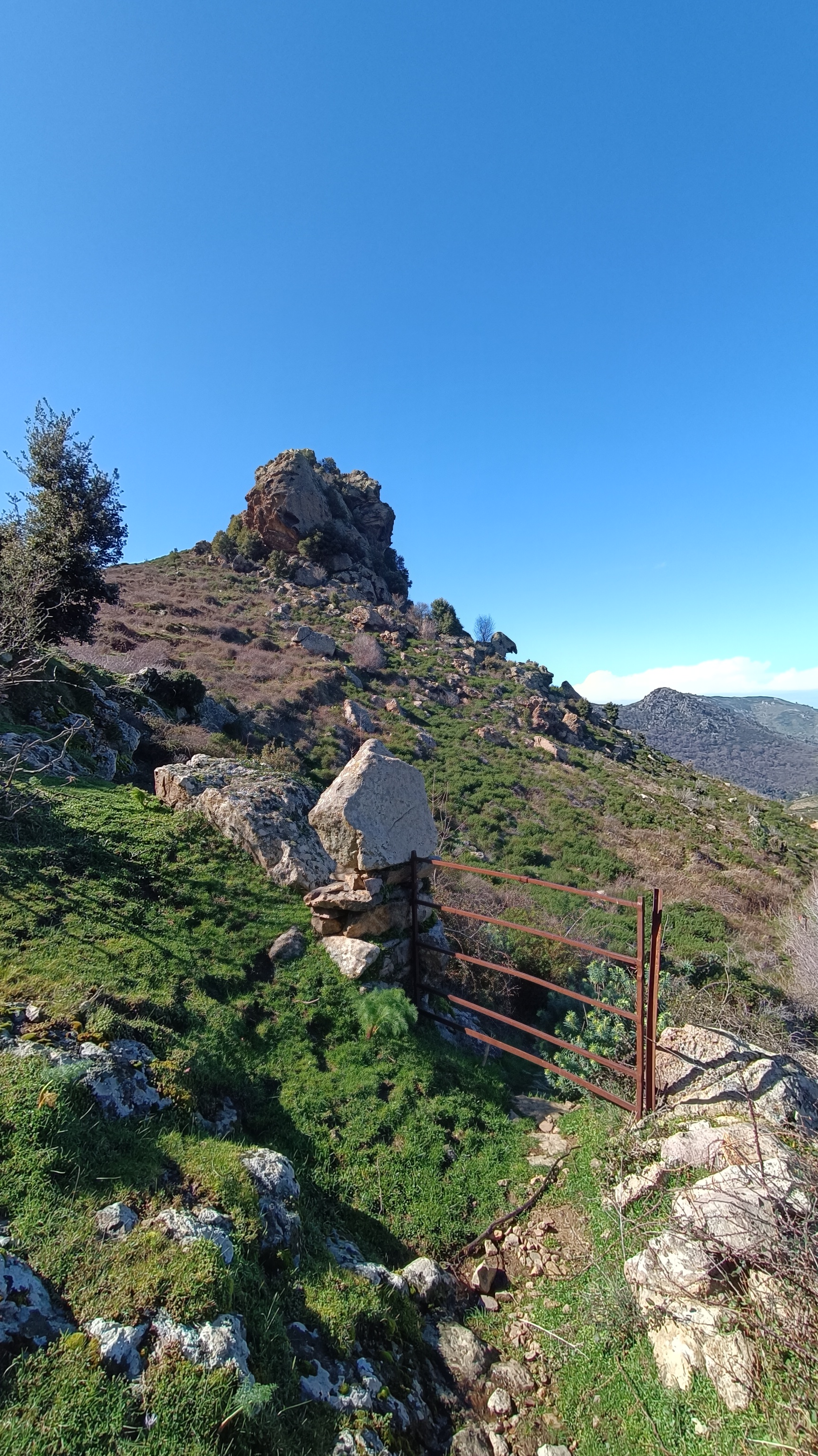 From the gate, head uphill towards the fenced chestnut tree, then head uphill right between the two summits. The path is in places still very brambly. The path curves initially heads off to the right and then around to the left and joins an old terraced trail before reaching a col. You are nearly there! Be attentive to the waymarks (still RED) that go through the maquis, skirting around the read side of the rocky crag. The path then takes a final left turn and the path crosses a walled terrace with a drop to your right, and you see the main gateway. The ruins of the house, nestled under the rock, U Casa di U Banditu is through the gate, explore with care ! Retrace your steps afterwards.