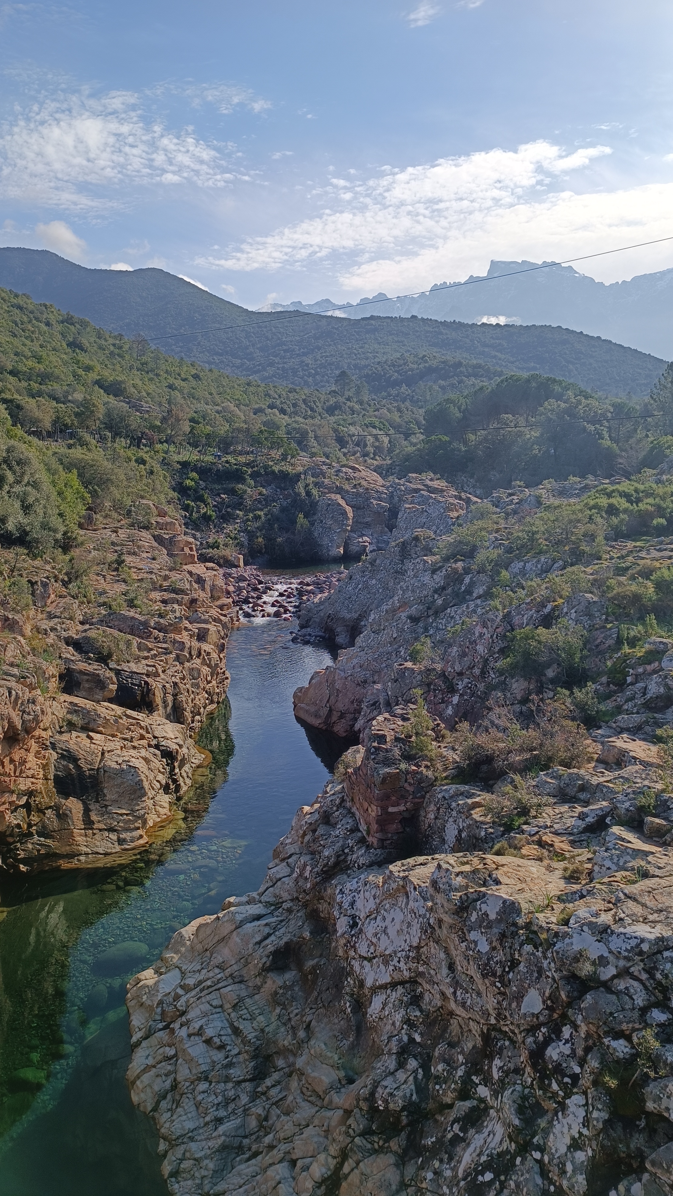 Just before the bridge, turn right following the sign for the Pruniciale and Tuarelli loop. The trail is marked in orange and purple/yellow and follows the Fango River along the rocks (some sections have chains that require your attention). There are many places where it is tempting to swim in the natural pools. The trail was once the old transhumance route from Galeria to Niolu and follows the river, never leaving it for long. A final climb through the juniper, strawberry tree, and holm oak forest takes you past a rocky area, past an old caravan, before descending onto the track leading to the former TUARELLI campsite. You are back at your starting point; follow the paved road to the left and cross the bridge.