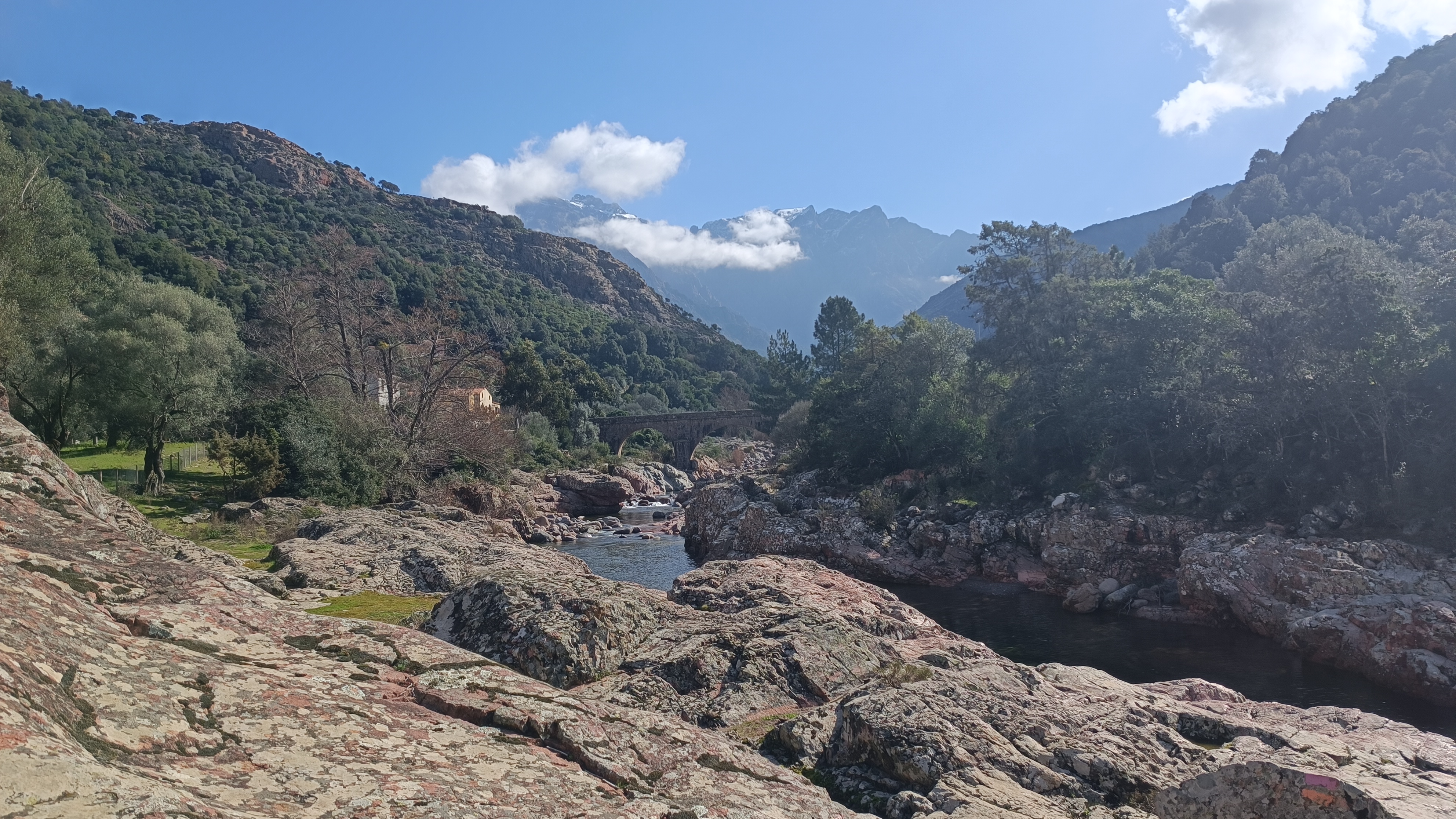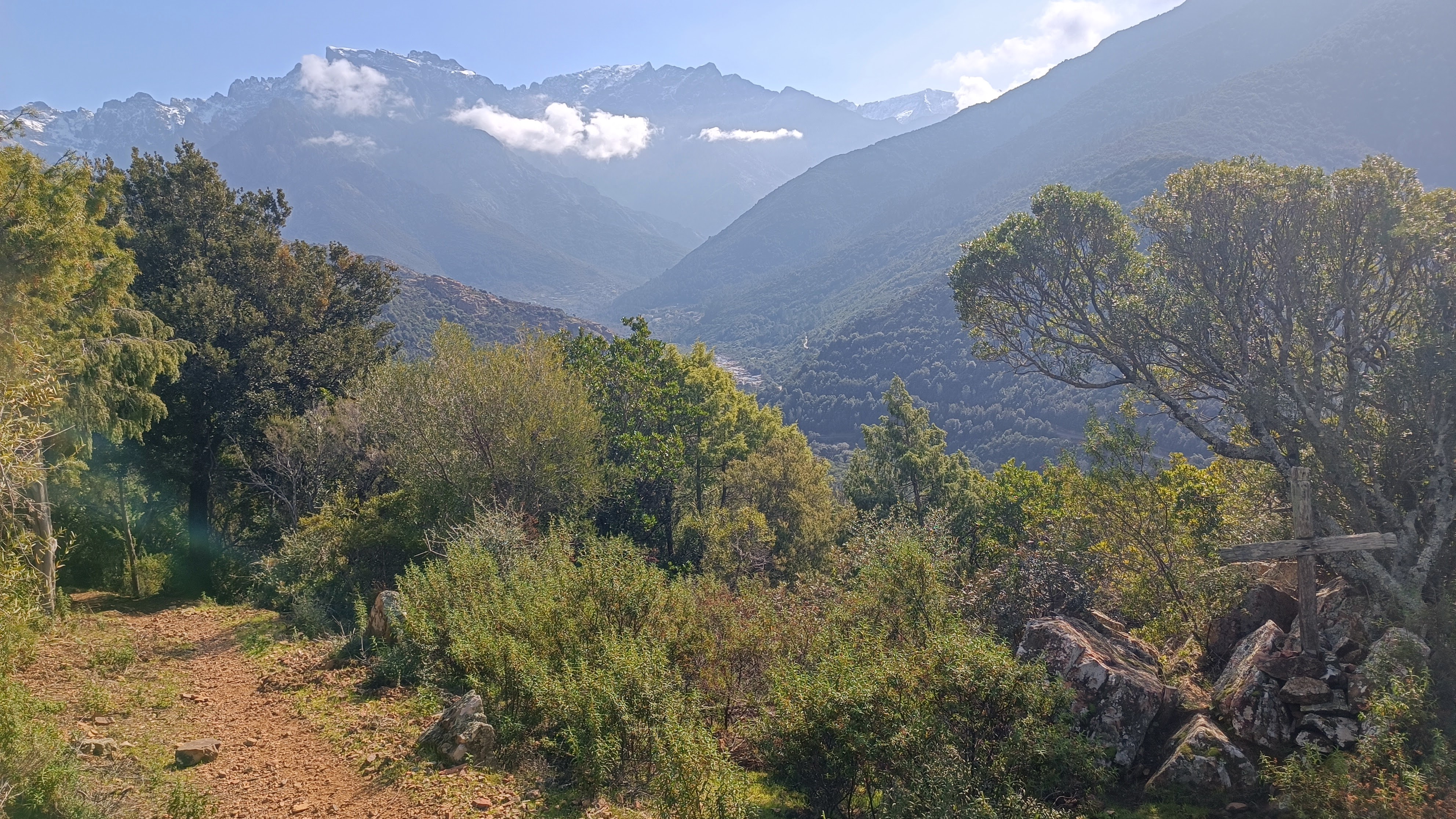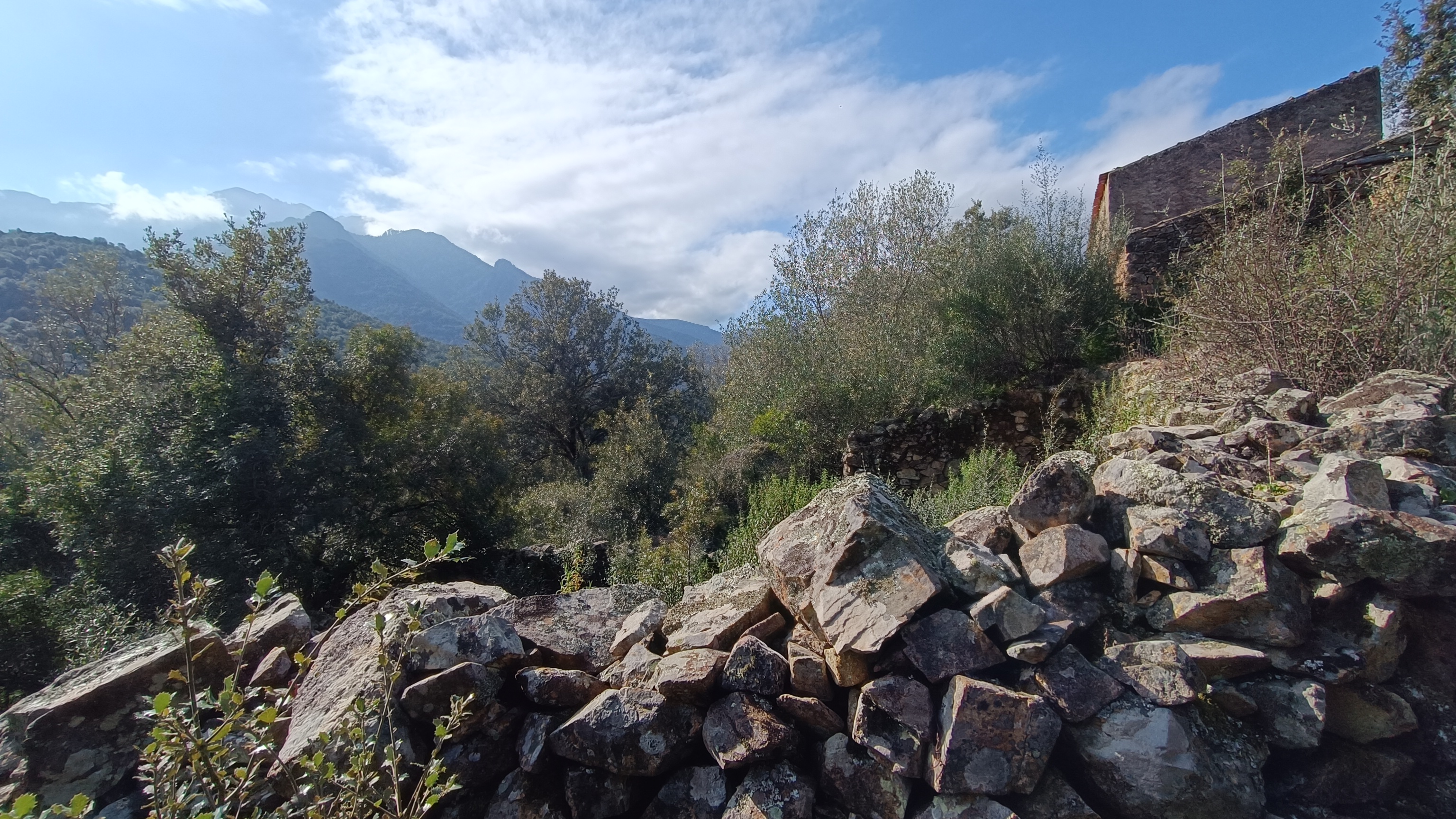 After crossing the stream, the path climbs steeply for about 700 meters through a dense, dark forest of holm oaks, junipers, and strawberry trees. After the climb, you reach a chestnut grove with a view towards the sea, then the SAN GHJORGHJU ridge. Here, a beautiful panorama unfolds over the FANGO valley, from the upper valley and the hamlets of MONT ESTREMU and BARGHJANA, dominated by PAGLIA ORBA (2525m), the second highest peak in Corsica, down to the river that flows into the sea in a delta at GALERIA. After the pass, the vegetation changes and the trail enters a low scrubland of rockrose, broom, and holm oak. Descend to a farmhouse located above the village of Manso. Follow a path to the right before the building, and then the occasional yellow markers along the paved road, which loops back through Manso and arrives at the bridge.