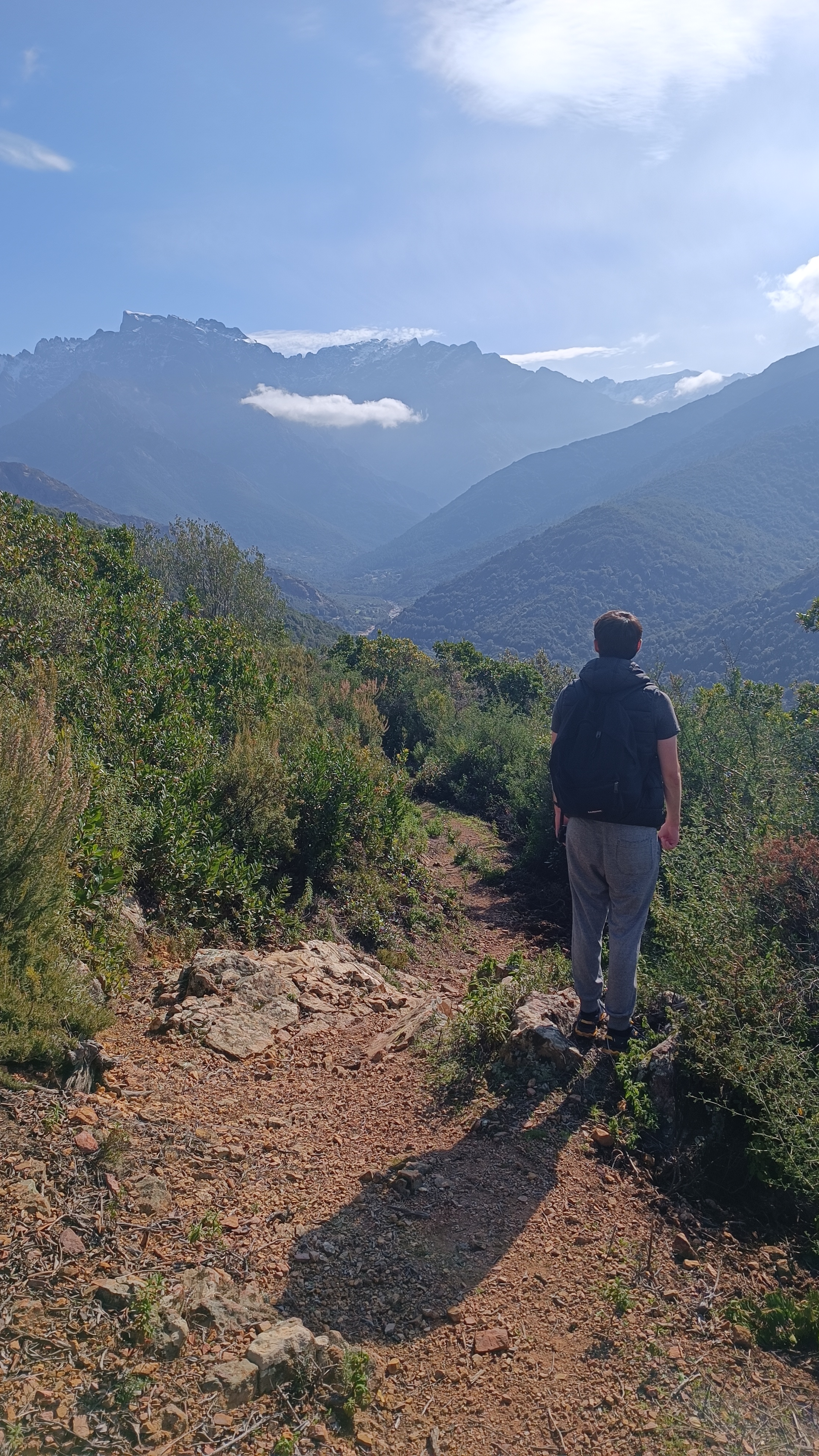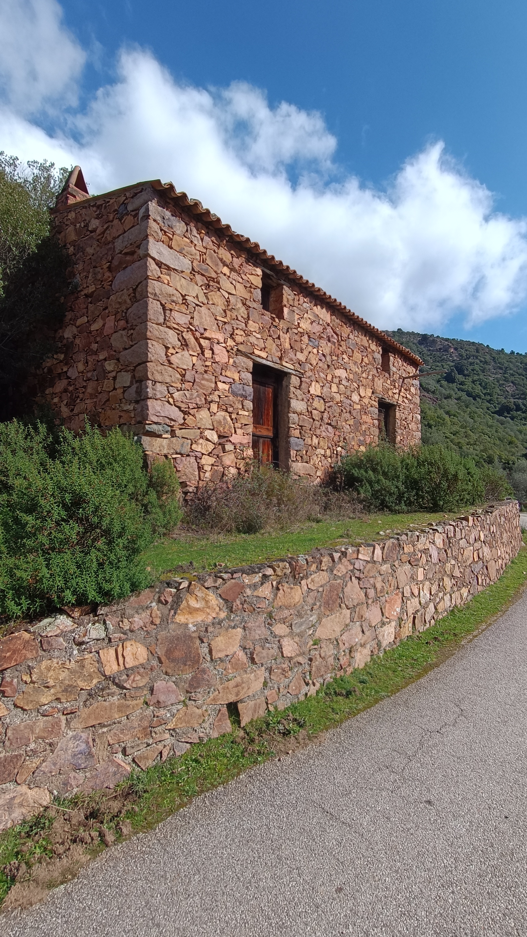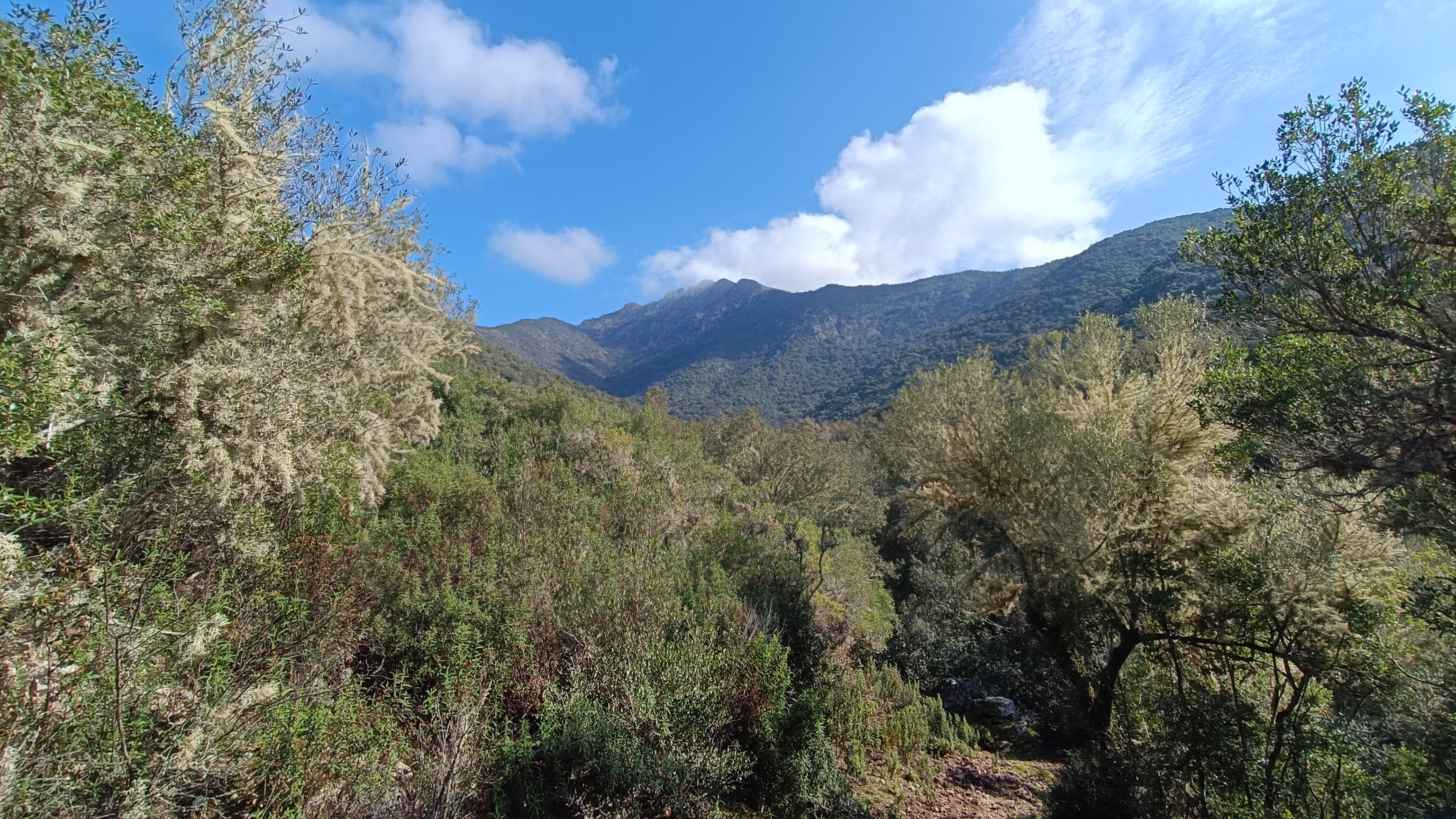 After crossing the stream, the path climbs steeply for about 700 meters through a dense, dark forest of holm oaks, junipers, and strawberry trees. After the climb, you reach a chestnut grove with a view towards the sea, then the SAN GHJORGHJU ridge. Here, a beautiful panorama unfolds over the FANGO valley, from the upper valley and the hamlets of MONT ESTREMU and BARGHJANA, dominated by PAGLIA ORBA (2525m), the second highest peak in Corsica, down to the river that flows into the sea in a delta at GALERIA. After the pass, the vegetation changes and the trail enters a low scrubland of rockrose, broom, and holm oak. Descend to a farmhouse located above the village of Manso. Follow a path to the right before the building, and then the occasional yellow markers along the paved road, which loops back through Manso and arrives at the bridge.