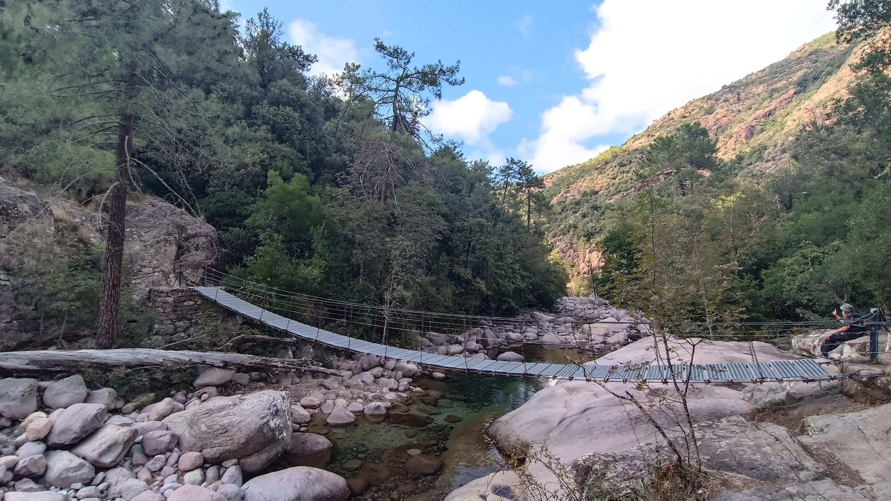 Park in the car park in front of the AUBERGE DE LA FORÊT in Bonifatu; the trailhead is located in the lower car park. Descend the rocky path shaded by holm oaks and marked ORTU DI U POBBIU and BOUCLE DE FINNOCCHI / BOUCLE DE FICAGHJOLA. After 5 minutes, you will reach the footbridge that crosses the FIGARELLA stream (altitude 490 m). Cross the bridge and take the path to the left that runs alongside the stream above. After 75 m, turn right waymarked BLUE passing a charcoal burning area. The path climbs in zigzags with occasional views for next 30 minutes under the trees, before flattening out under the pines as you will reach a T-junction with the FINNOCCHI loop (743 m altitude).