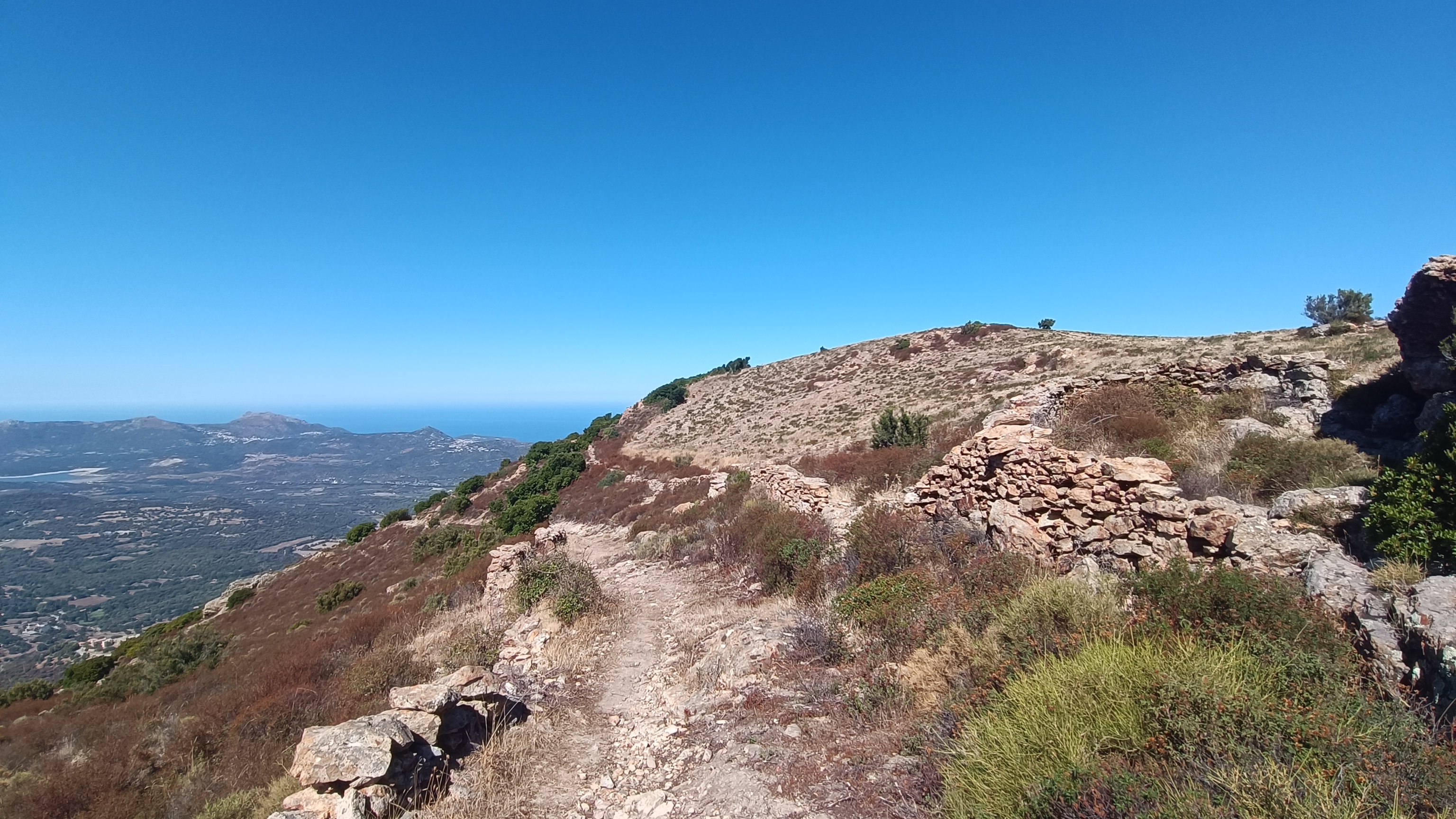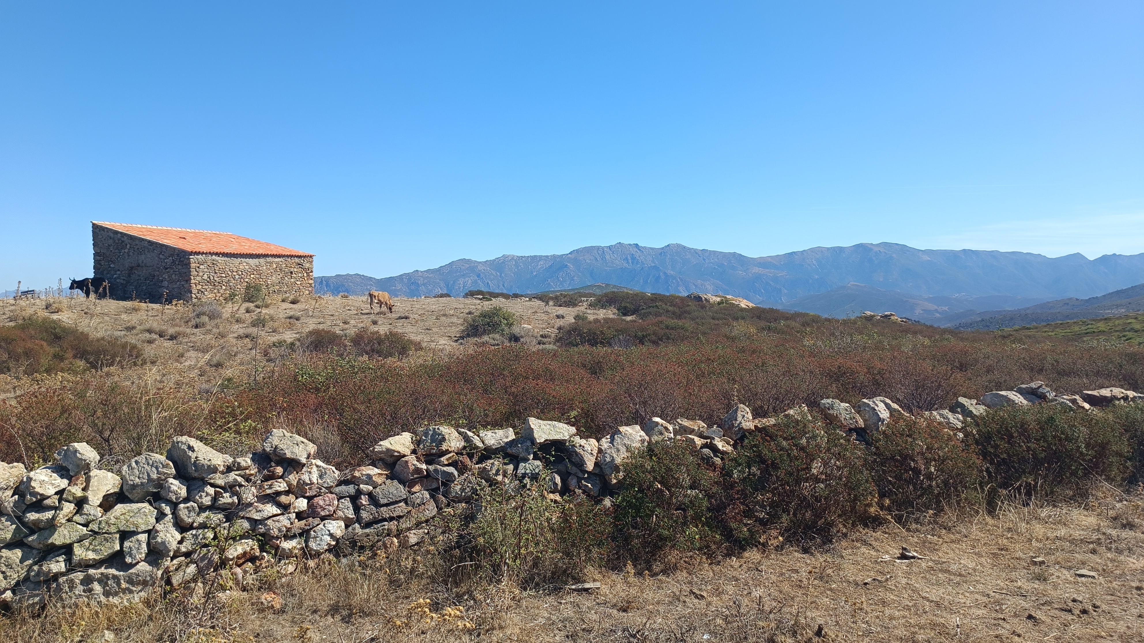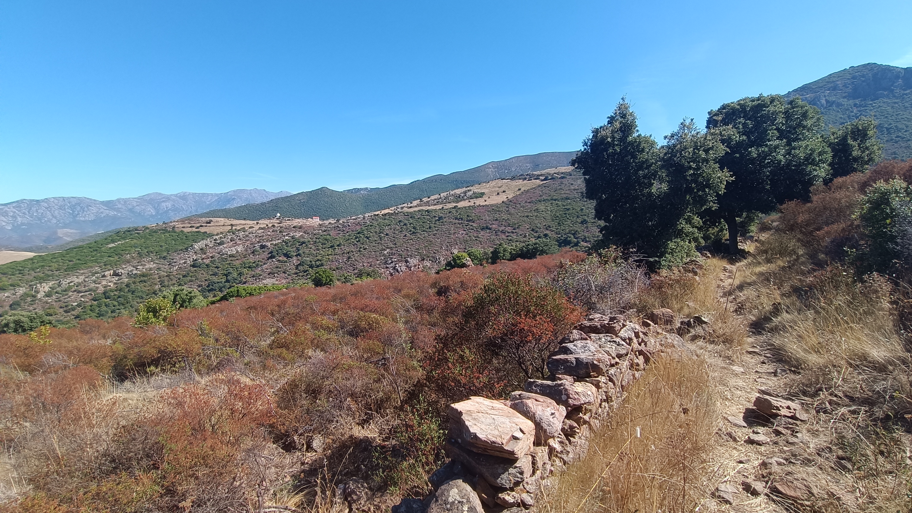 Head towards the Church of San Tumasgiu XVII, then ascend towards the Confraternity of Sant Stefano, following the path and yellow markers to the top of the steps leading to the upper part of the village, where you’ll find a paved road. Turn left and descend gently along this road until a concrete track rises on your right after 300 meters. Follow this track, keeping an eye out for the yellow signs for the San Antone Loop. The concrete ends at the water station, but the track continues; follow it to an antenna. From there, a path turns sharply left and begins a steep climb through low scrubland of heather and rockrose, eventually joining the beautiful old paved and walled mule track that once connected Corte to the Balagne region. During the ascent, take time to admire the view around the Regino hill towards L’Île-Rousse. After 2 km, you reach the ridge. Continue along the wide path that turns left towards a sheepfold or PAGLIAGHJU, at SAN ANTONE, the site of a former HERMITAGE, and take the path near the wall. The view opens up in all directions, and you arrive at a junction of wide paths with a sign indicating SAN ANTONE LOOP.