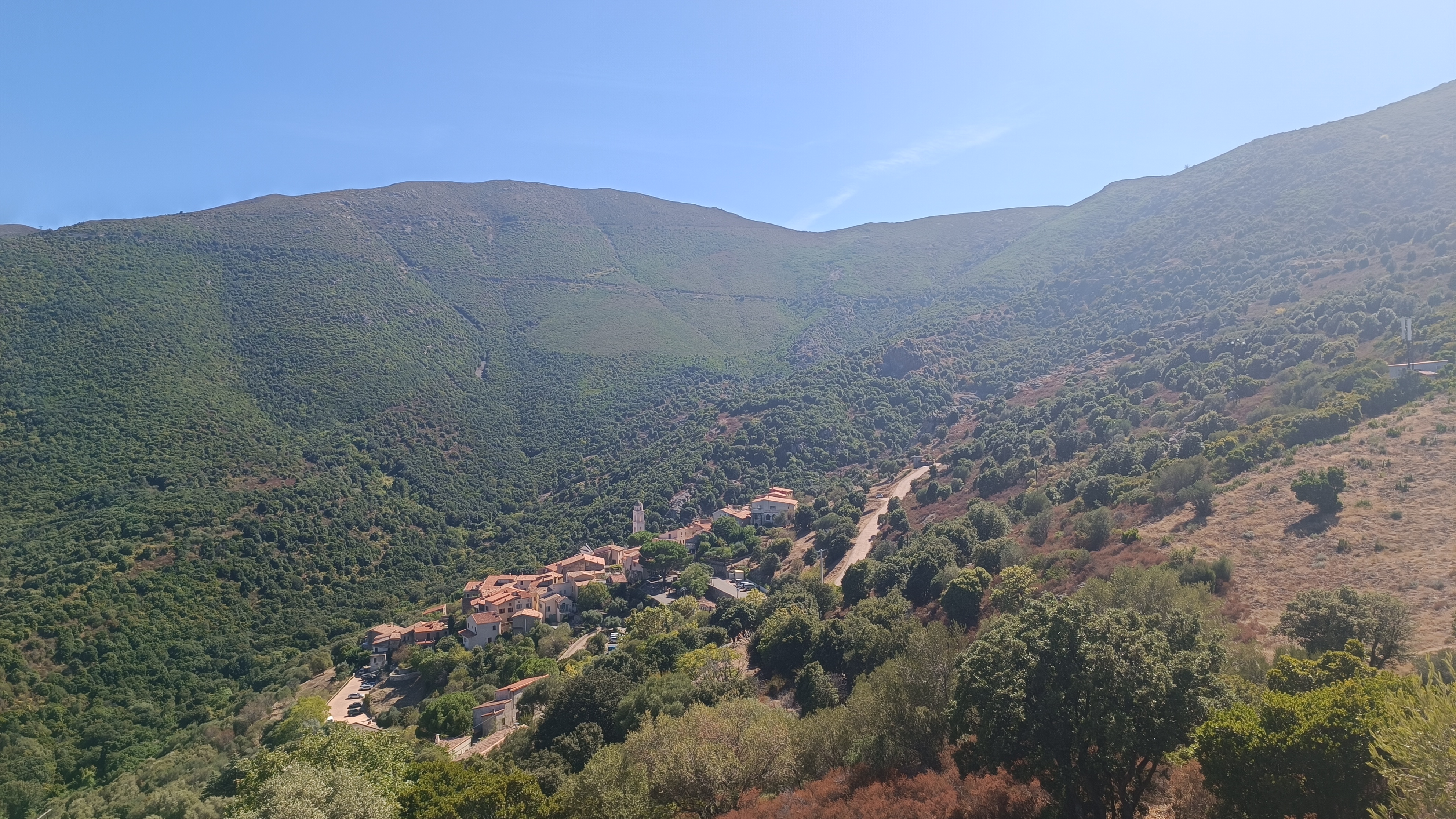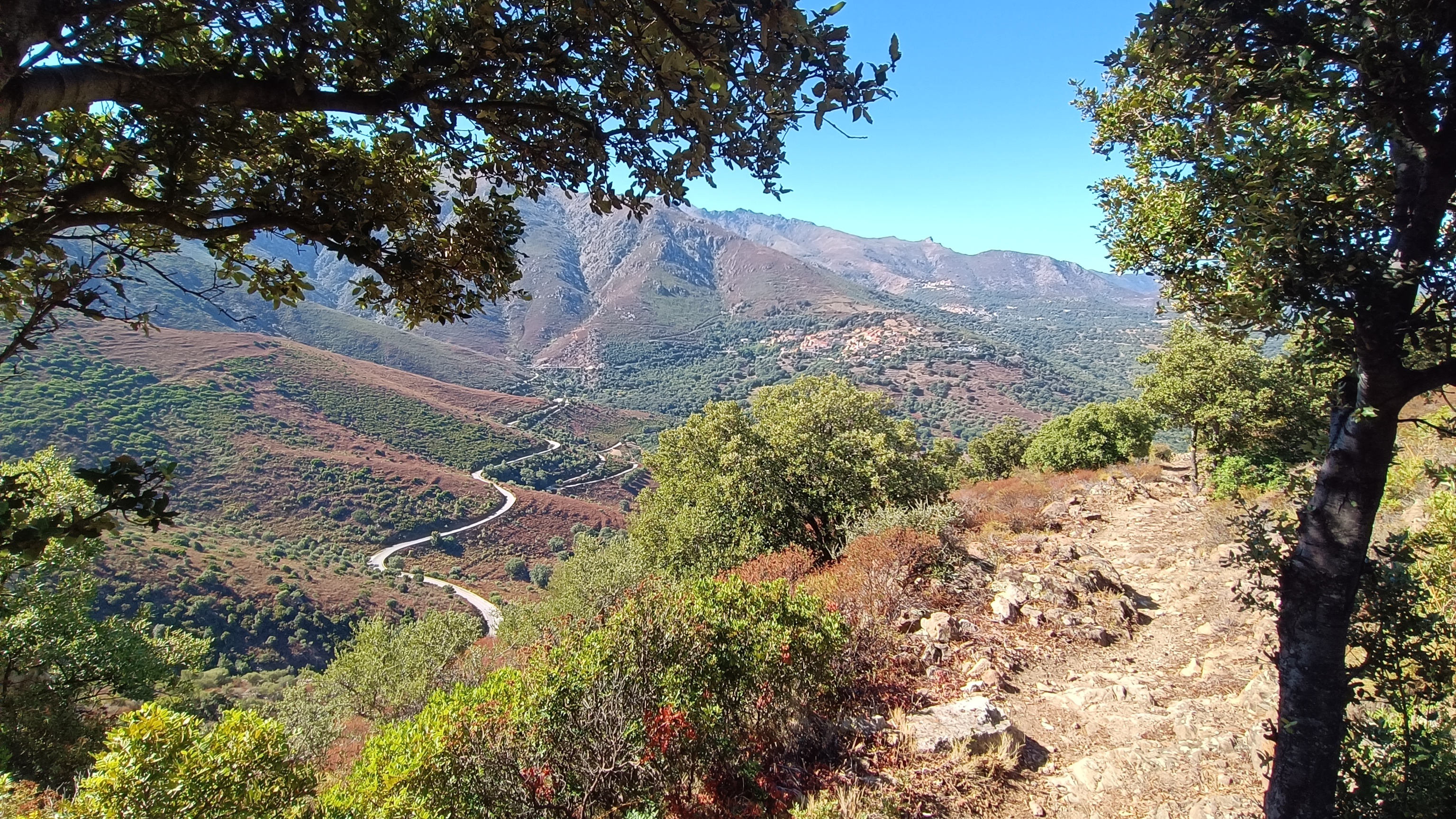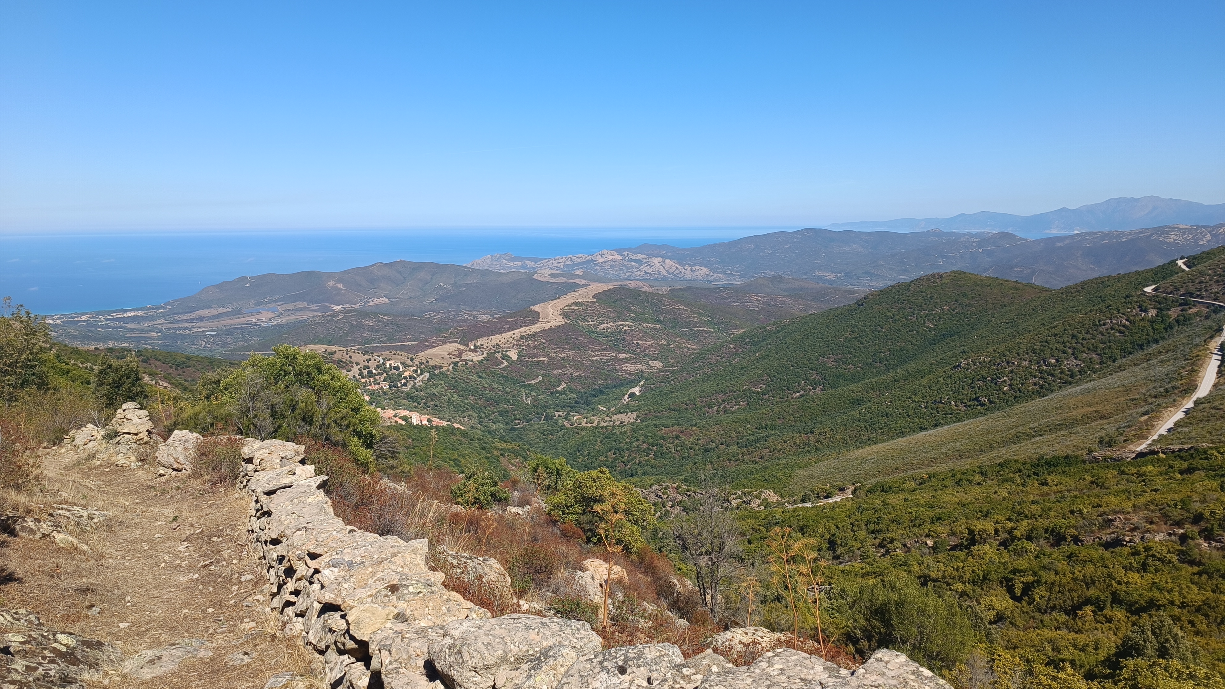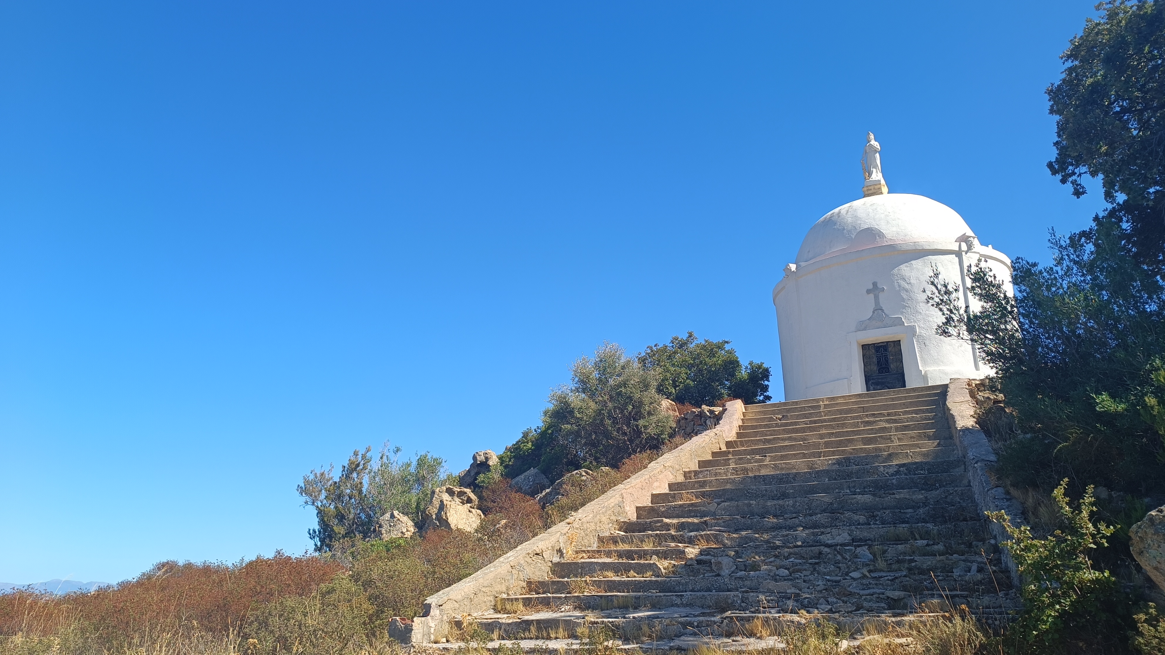 Head towards the Church of San Tumasgiu XVII, then ascend towards the Confraternity of Sant Stefano, following the path and yellow markers to the top of the steps leading to the upper part of the village, where you’ll find a paved road. Turn left and descend gently along this road until a concrete track rises on your right after 300 meters. Follow this track, keeping an eye out for the yellow signs for the San Antone Loop. The concrete ends at the water station, but the track continues; follow it to an antenna. From there, a path turns sharply left and begins a steep climb through low scrubland of heather and rockrose, eventually joining the beautiful old paved and walled mule track that once connected Corte to the Balagne region. During the ascent, take time to admire the view around the Regino hill towards L’Île-Rousse. After 2 km, you reach the ridge. Continue along the wide path that turns left towards a sheepfold or PAGLIAGHJU, at SAN ANTONE, the site of a former HERMITAGE, and take the path near the wall. The view opens up in all directions, and you arrive at a junction of wide paths with a sign indicating SAN ANTONE LOOP.