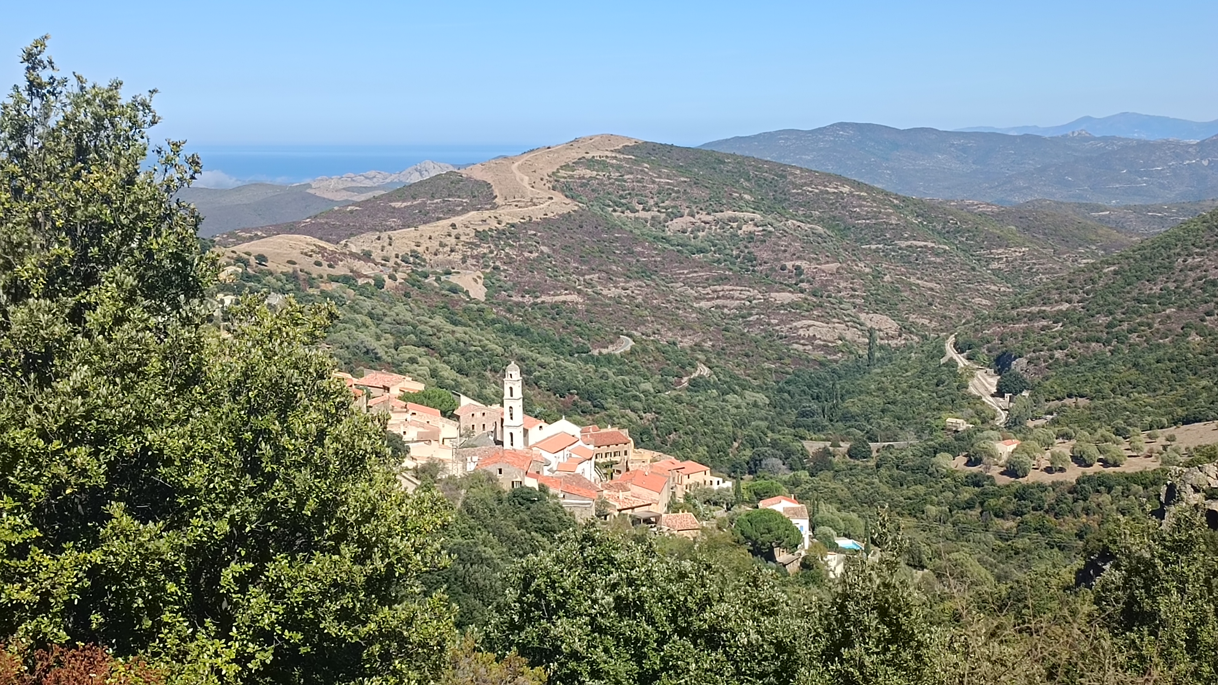 Descend here on a steep, stony path that joins another path at the abandoned hamlet of Quercioli. Follow the signs to the left indicating Belgodere Boucle San Antone and continue down the path to the RT301 road. Turn right and then immediately left. Follow the small road for about 700 meters, before the path climbs to your left towards Belgodere. The path ascends gradually and joins a track at a beautiful fountain. Turn right here and you will reach the road and the village of Belgodere.
