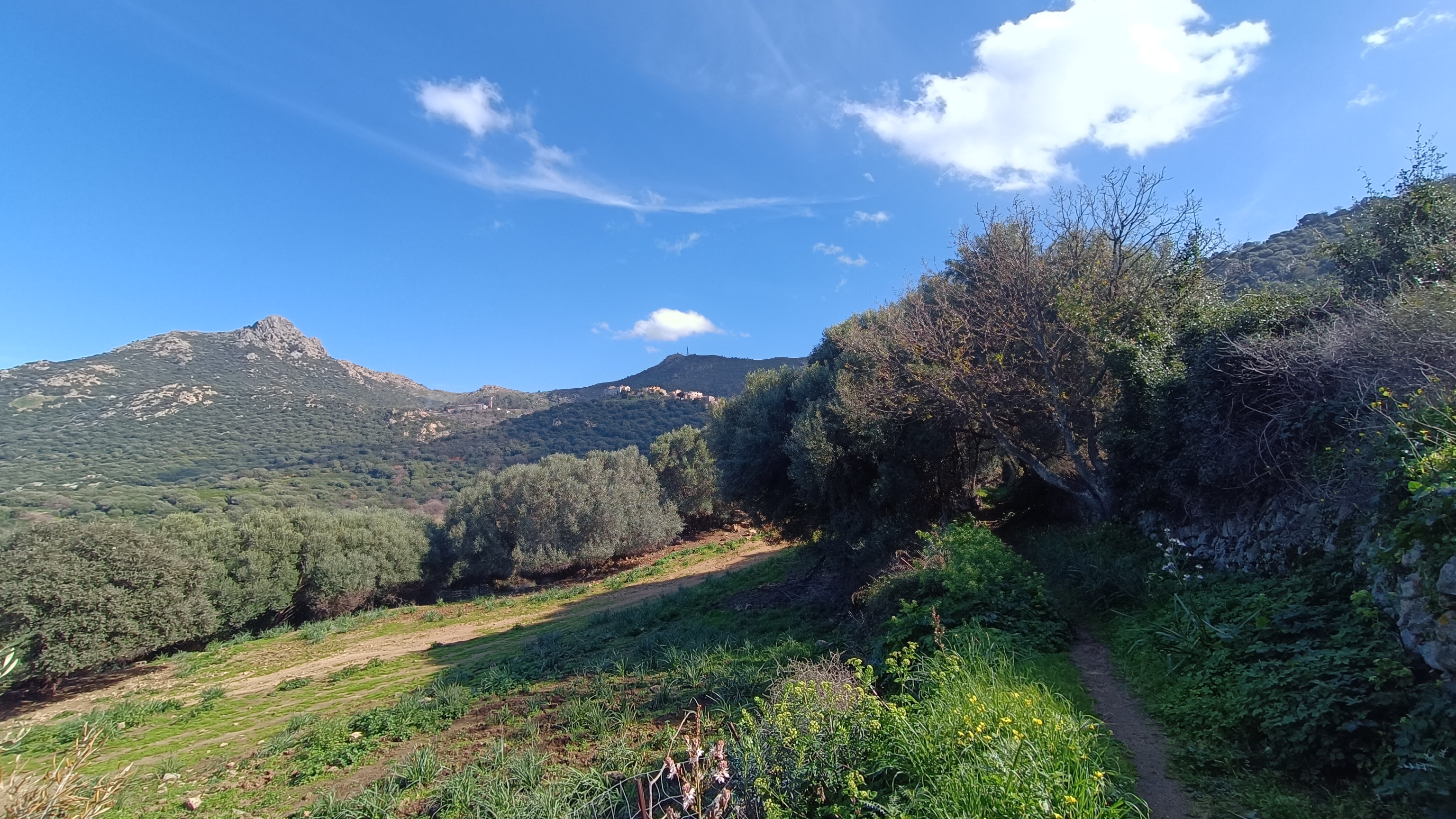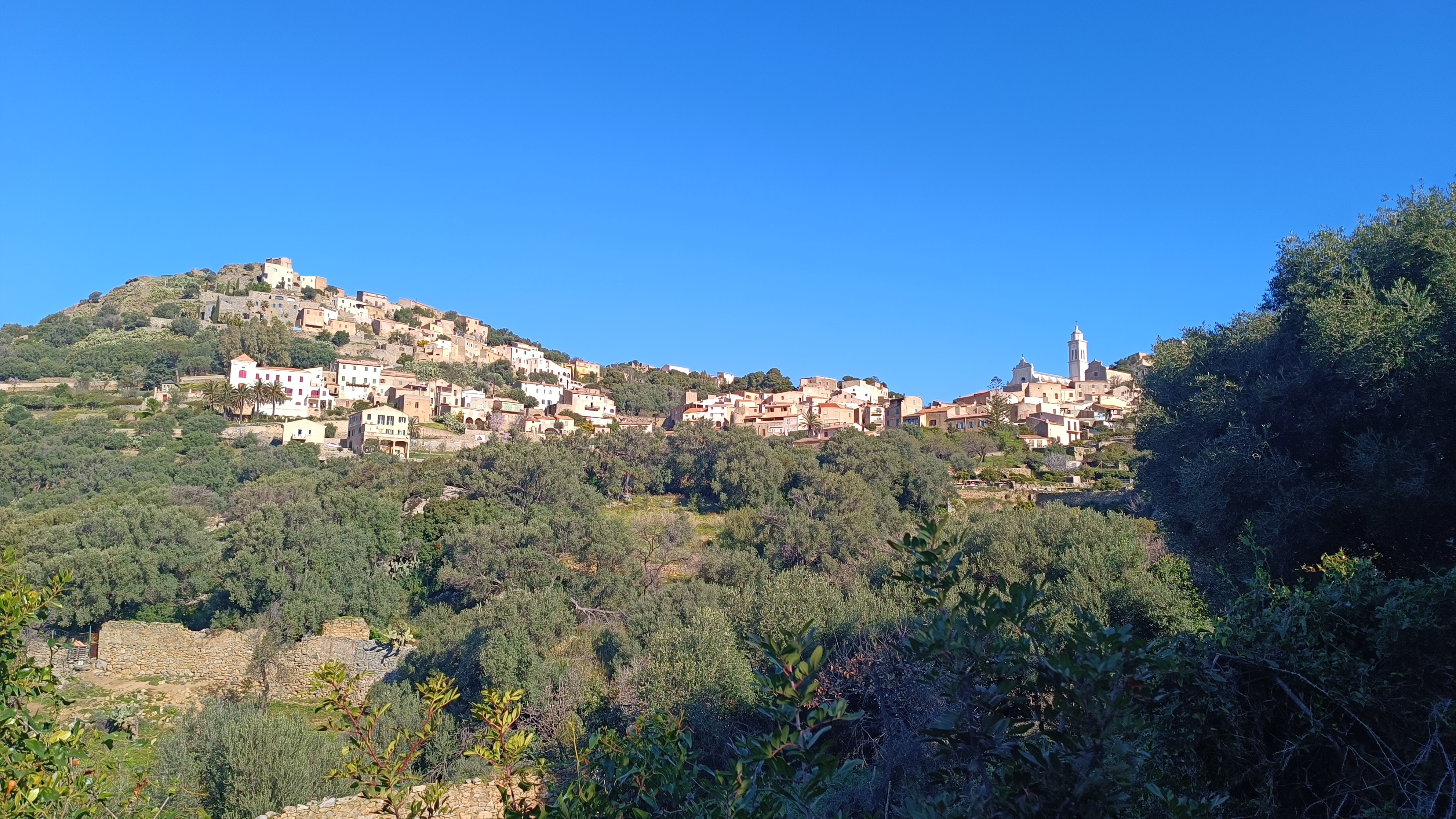 From the center of the village of CORBARA, begin by climbing towards the highest part of the village (YELLOW MARKERS). Walk up the narrow streets (you will see the tall bell tower of the Collegiate Church of Nunziata, dating from the 17th century). From the church square, turn right past a large house and head towards the Chapel of St. Roch. From there, follow the yellow markers uphill towards the Church NOTRE DAME DES SEPT DOULEURS.