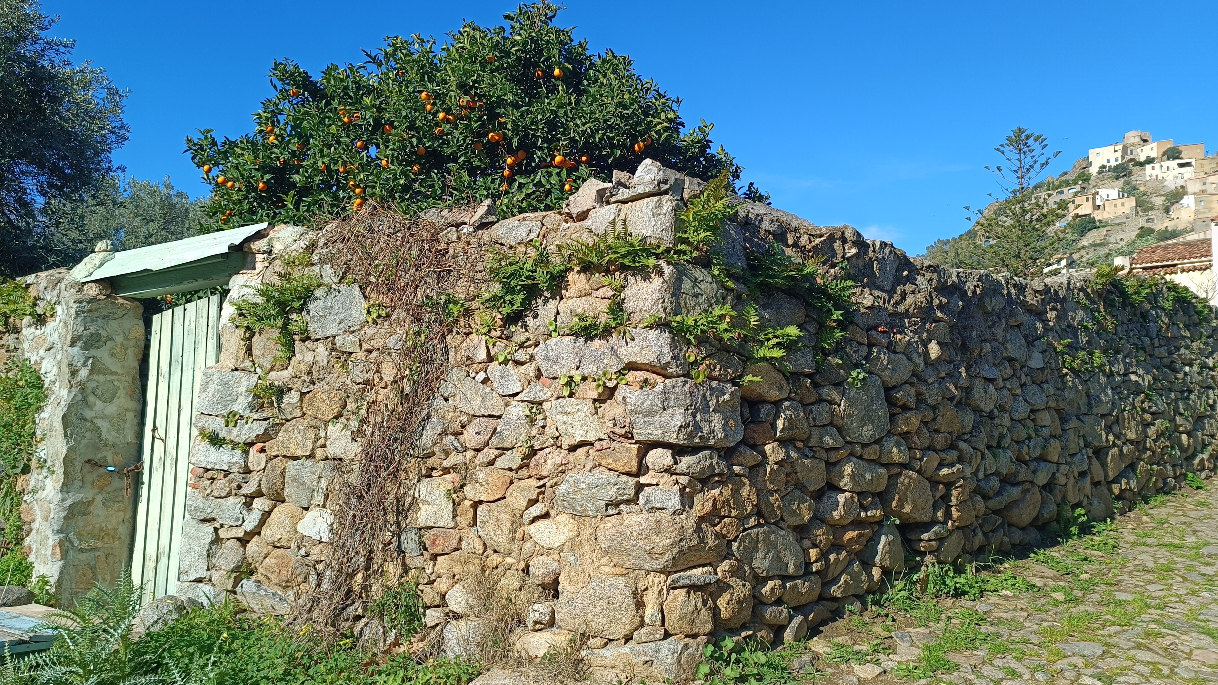 From the church, pass the entrance to the parking area, then take the lane on the left and turn left again ata funeral chapel to follow a track towards CORBARA. After about 150 meters on the track, a path descends to the right and crosses a small stream. Follow the relatively flat path through the maquis shrubland with views over the Aregno plain. The path enters the village of CORBARA by the wash house located in the lower part of the village. Take some time to explore the village.