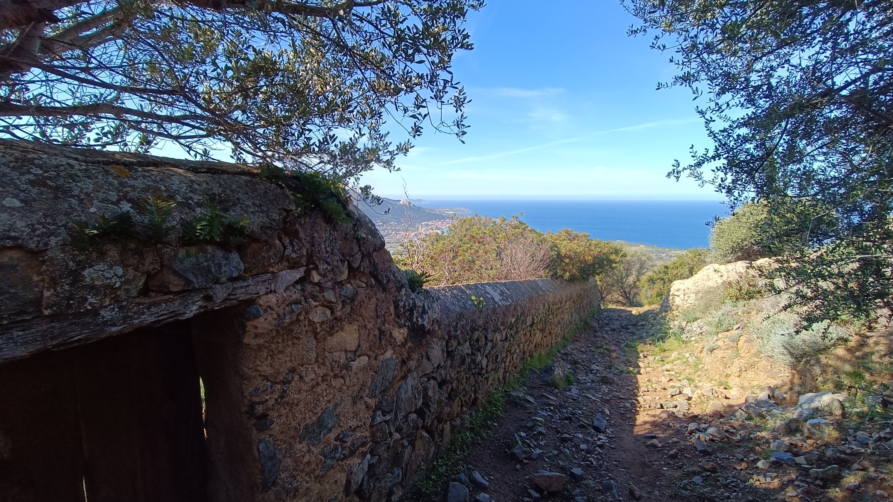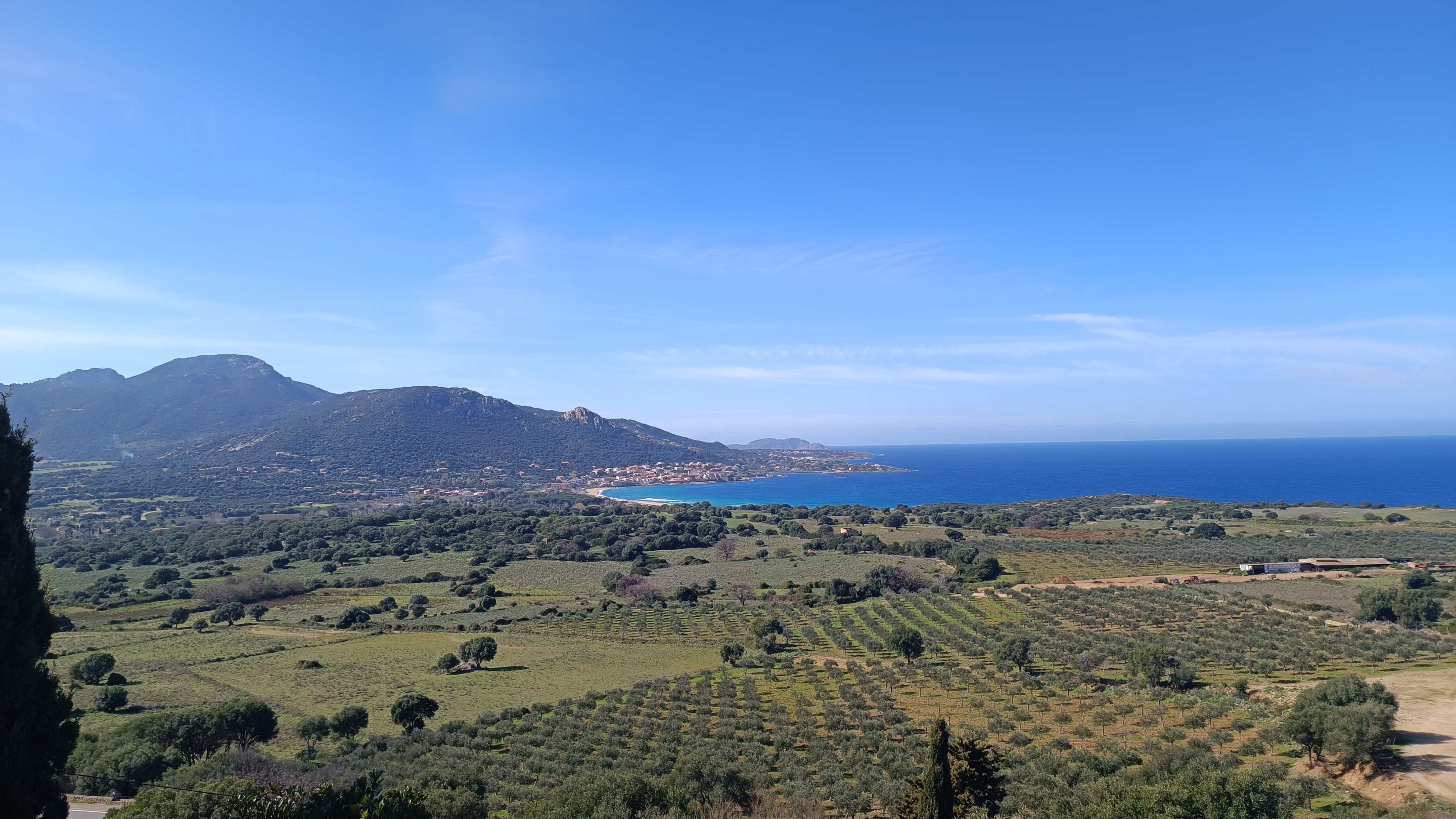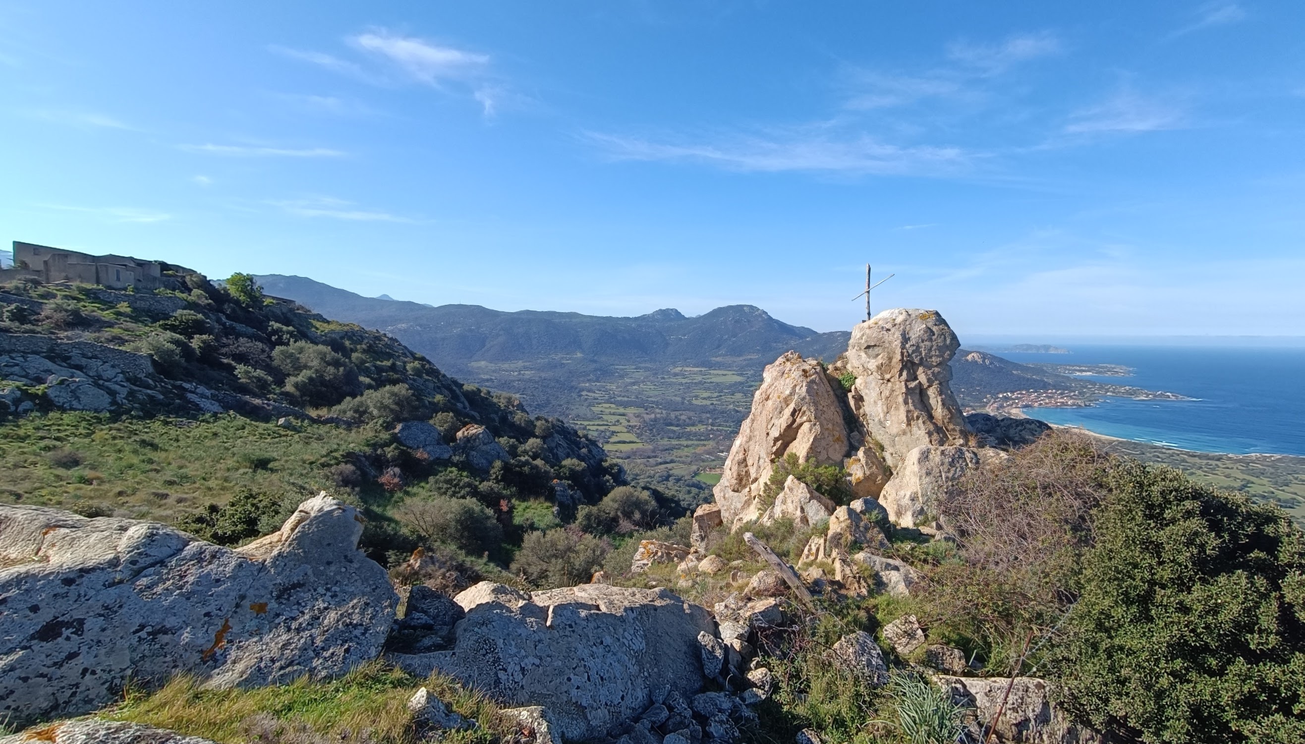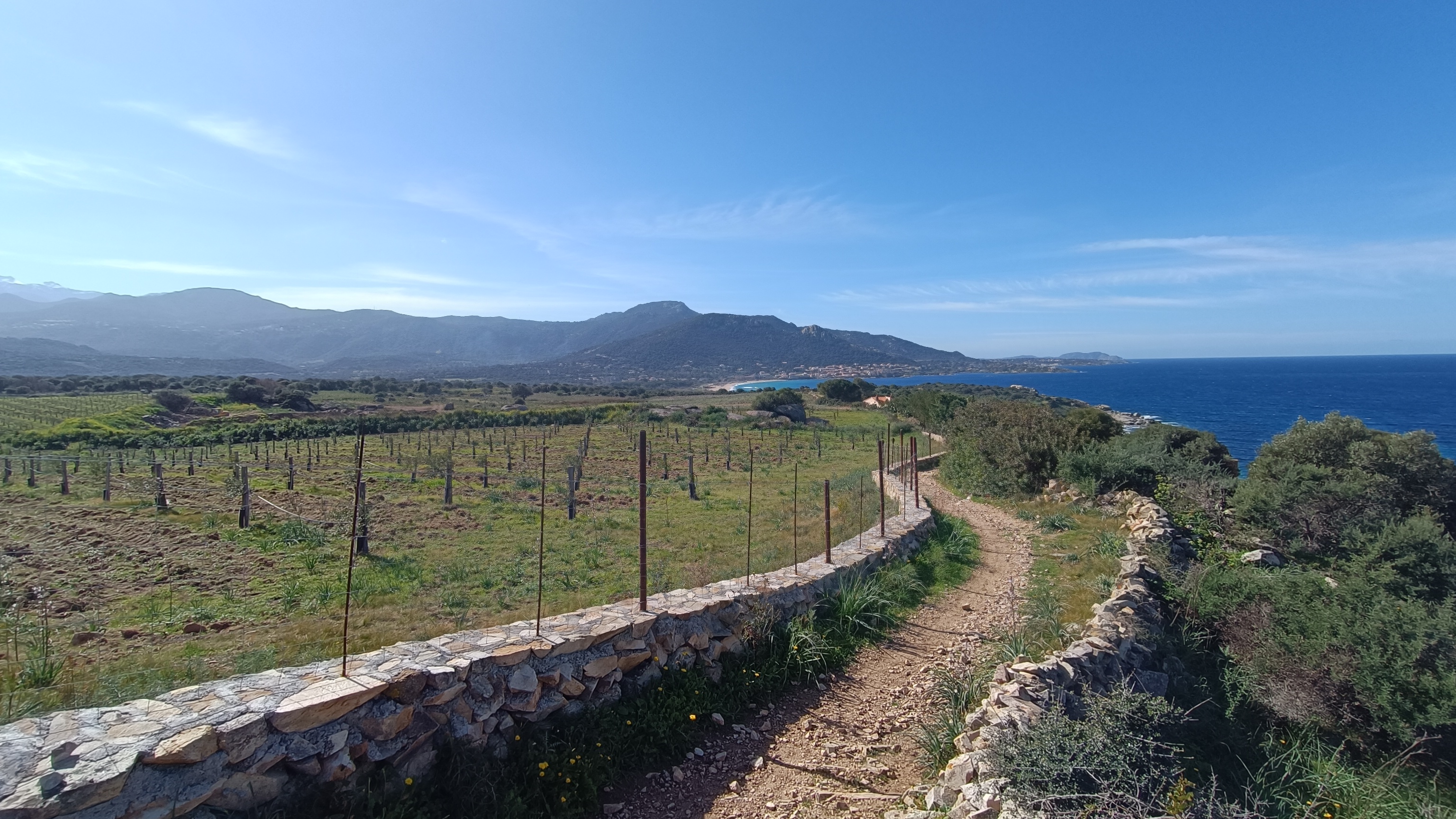 After the viewpoint, to descend, follow the yellow markers, zigzagging through the village (generally on cobbled streets). Turn right in front of a new house on a bend. The path runs alongside a garden wall to a viewpoint, then descends towards the D151 at the Chapel of St. Peter and St. Paul. From there, take the wide path that starts just below the road and leads into a residential area after 500 meters. Continue straight ahead, passing the villas of Carbunaja, to reach the D313. Turn left and walk down the road for 500 meters to the T30. At the roundabout, cross the road carefully and continue straight ahead into the residential area of Davia, following Avenue des Asphodels. After 100 meters, turn left onto a track (T-sign) and continue until it becomes a footpath, running alongside newly planted olive groves towards the sea. After 1 kilometer, you will reach a pedestrian crossing. Turn left to return to the parking area you left earlier. Walk through the tamarisk trees to explore the beach and the Punta Varcale headland before returning to your car.